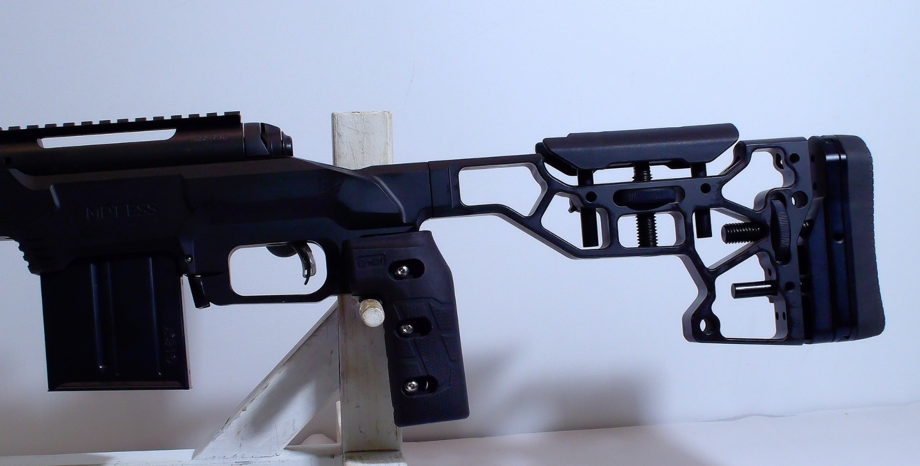 Aluminum MDT ESS stock shows minimal handling marks; condition is excellent.