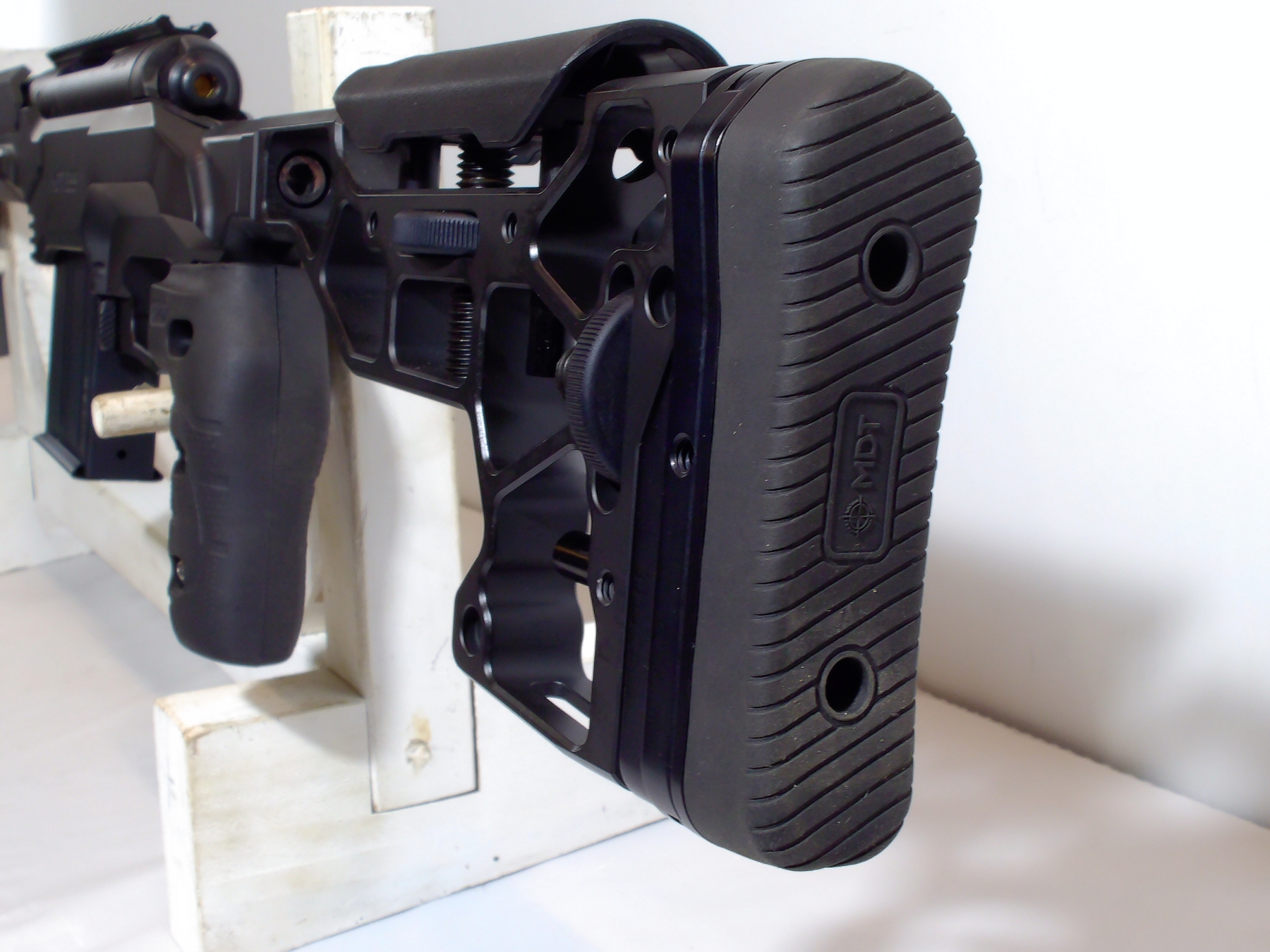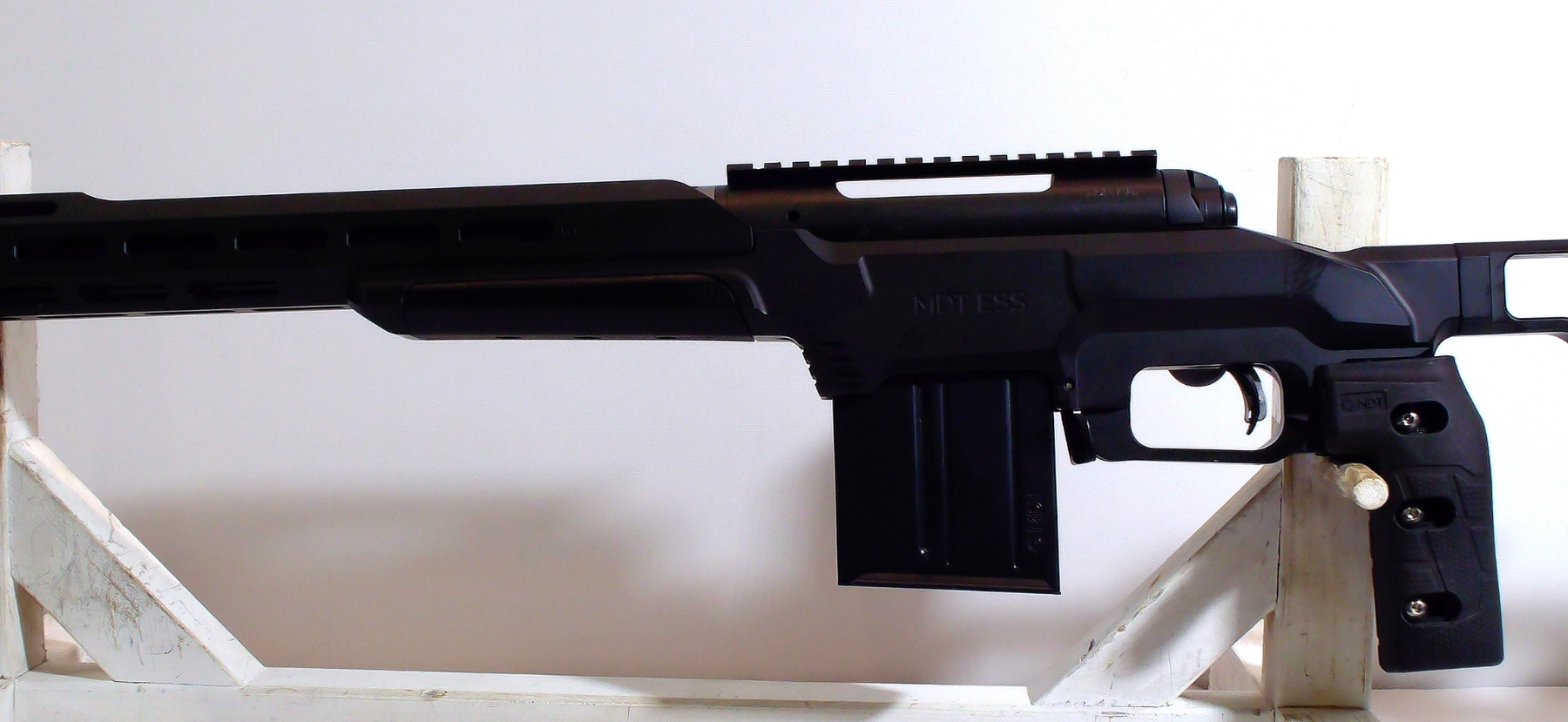 Aluminum MDT ESS stock shows minimal handling marks; condition is excellent.