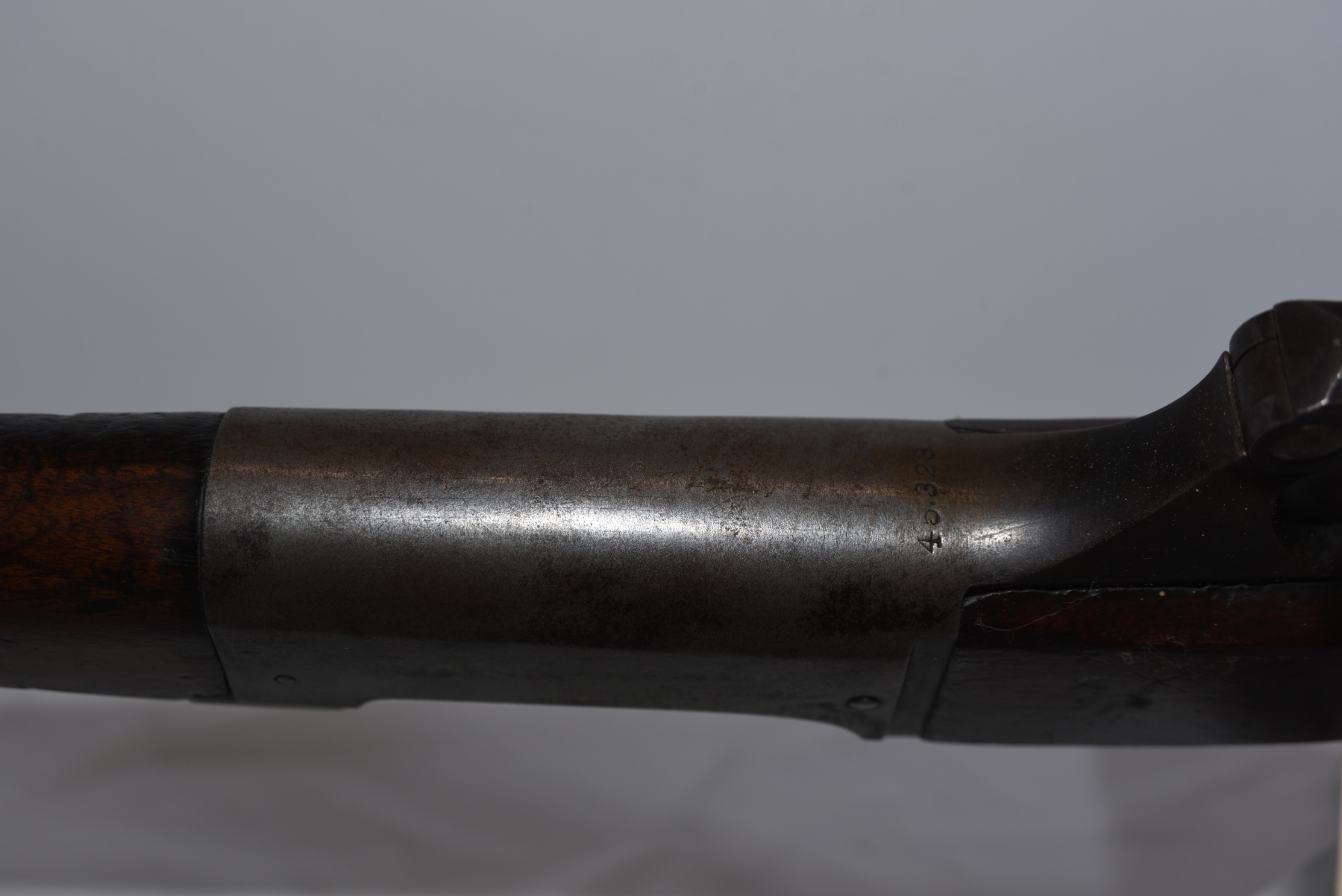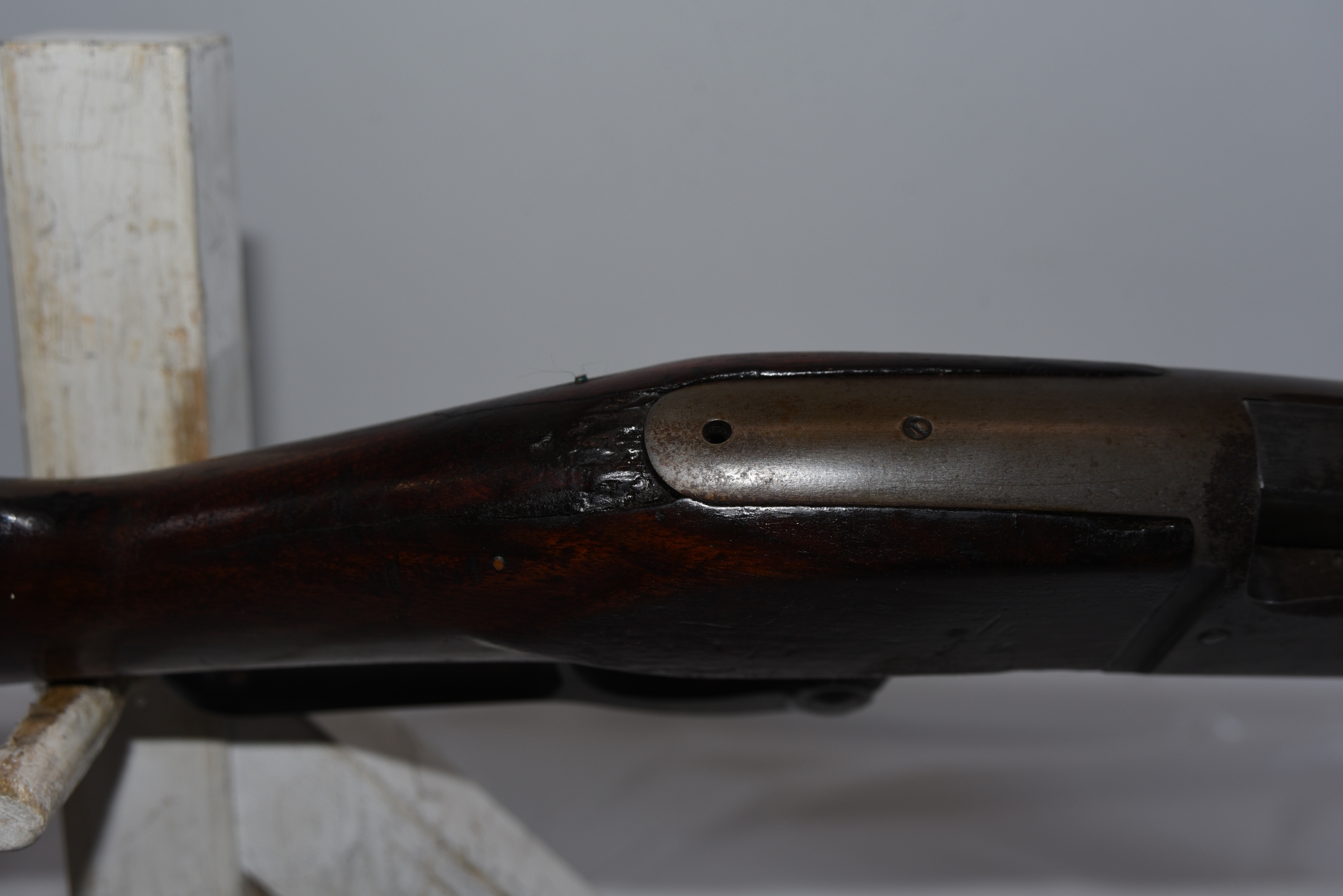 Wood stock shows large cracks in the upper grip area, there are scratches, scuffs, chips; condition is less than fair.
