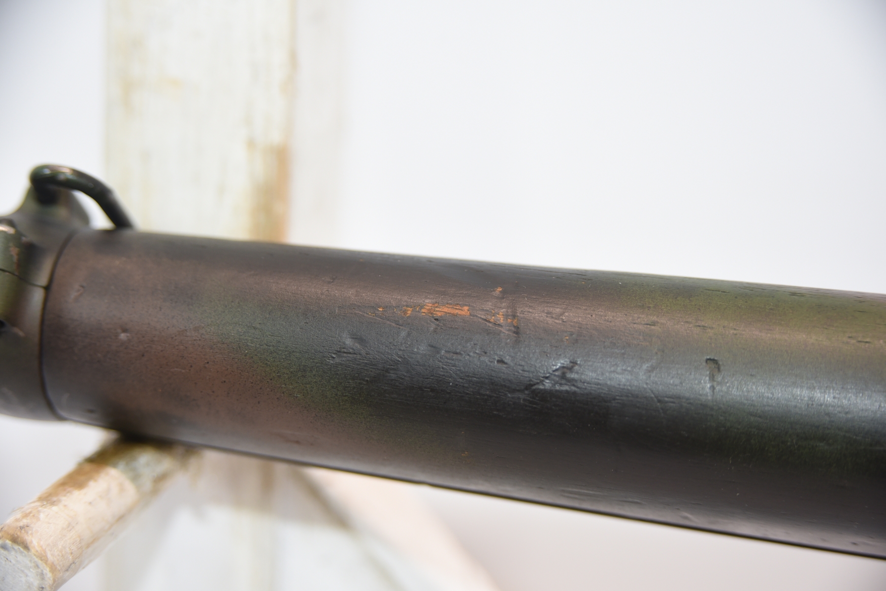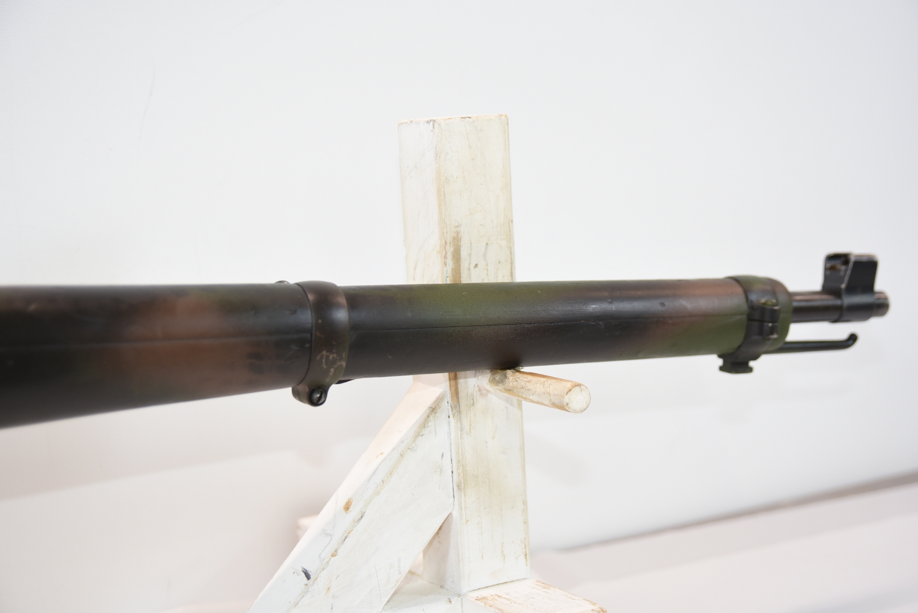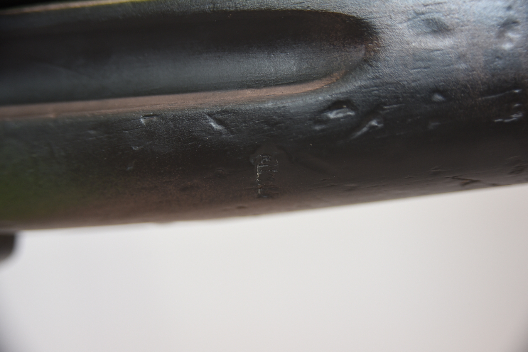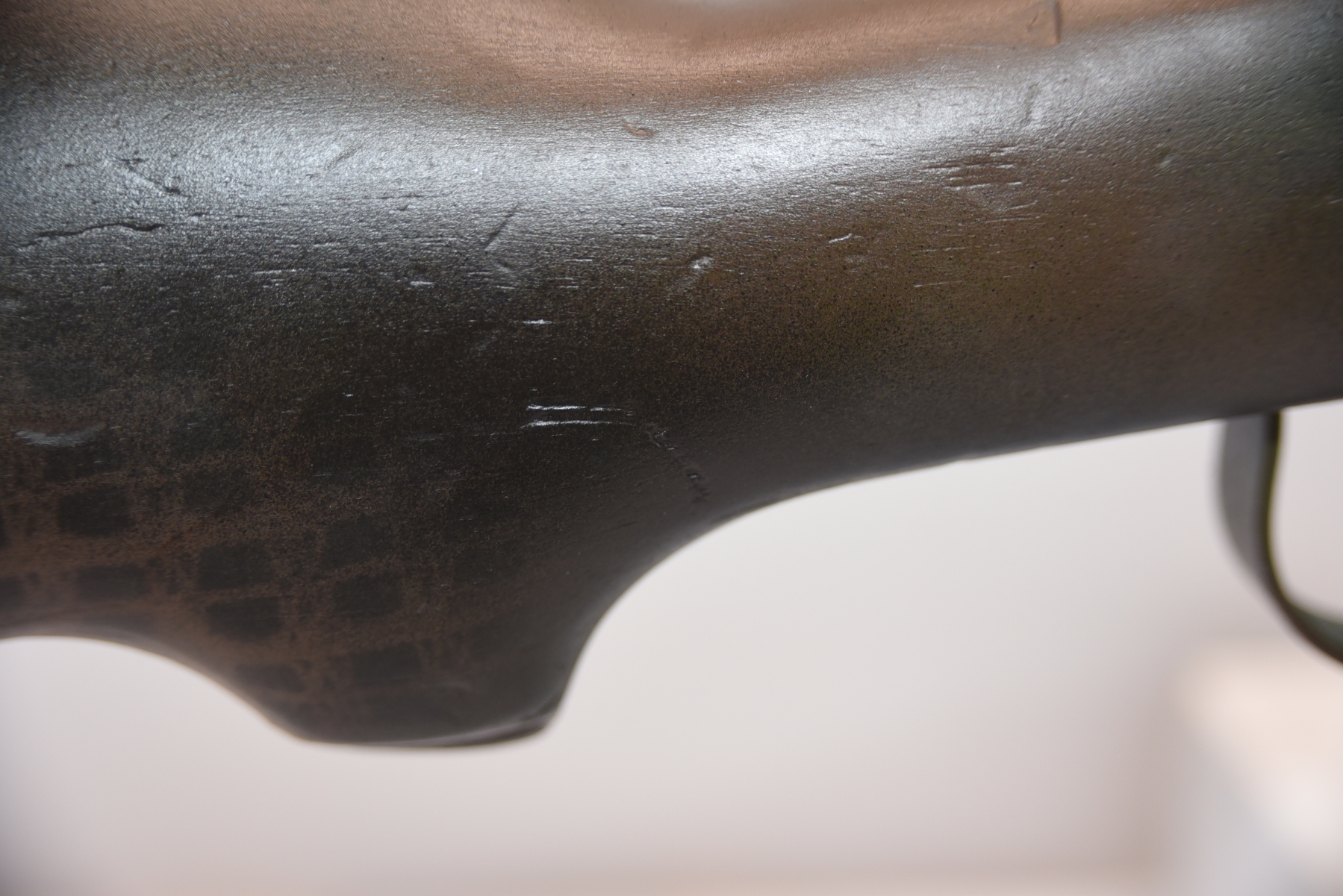 Wood stock shows dents, scratches, the stock has been painted, there are small chips in the stock, a chip in the grip heel; condition is fair.