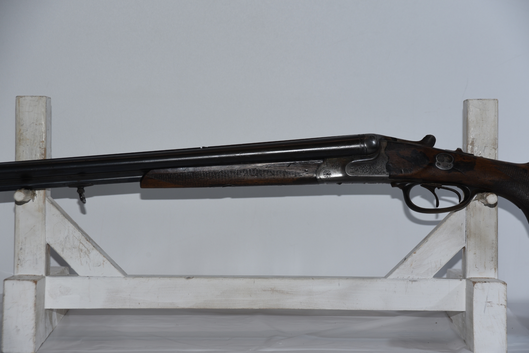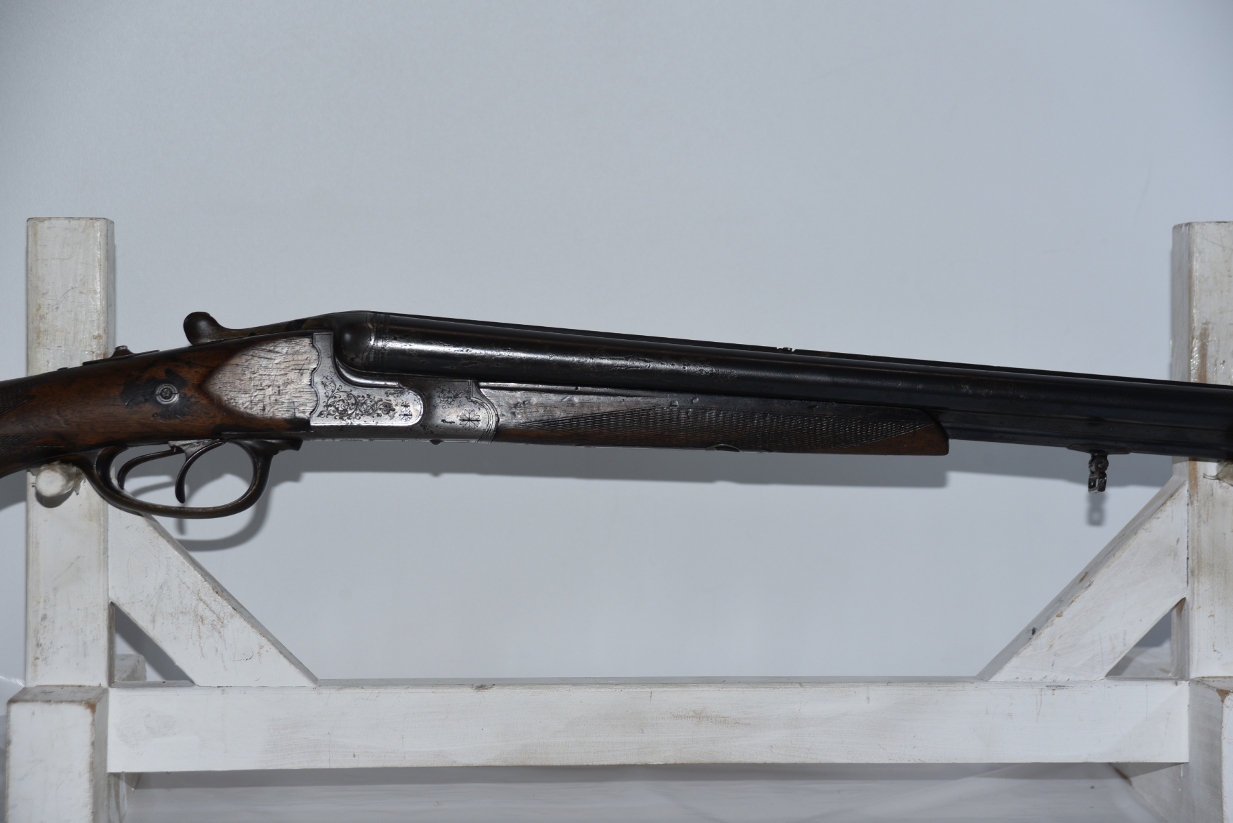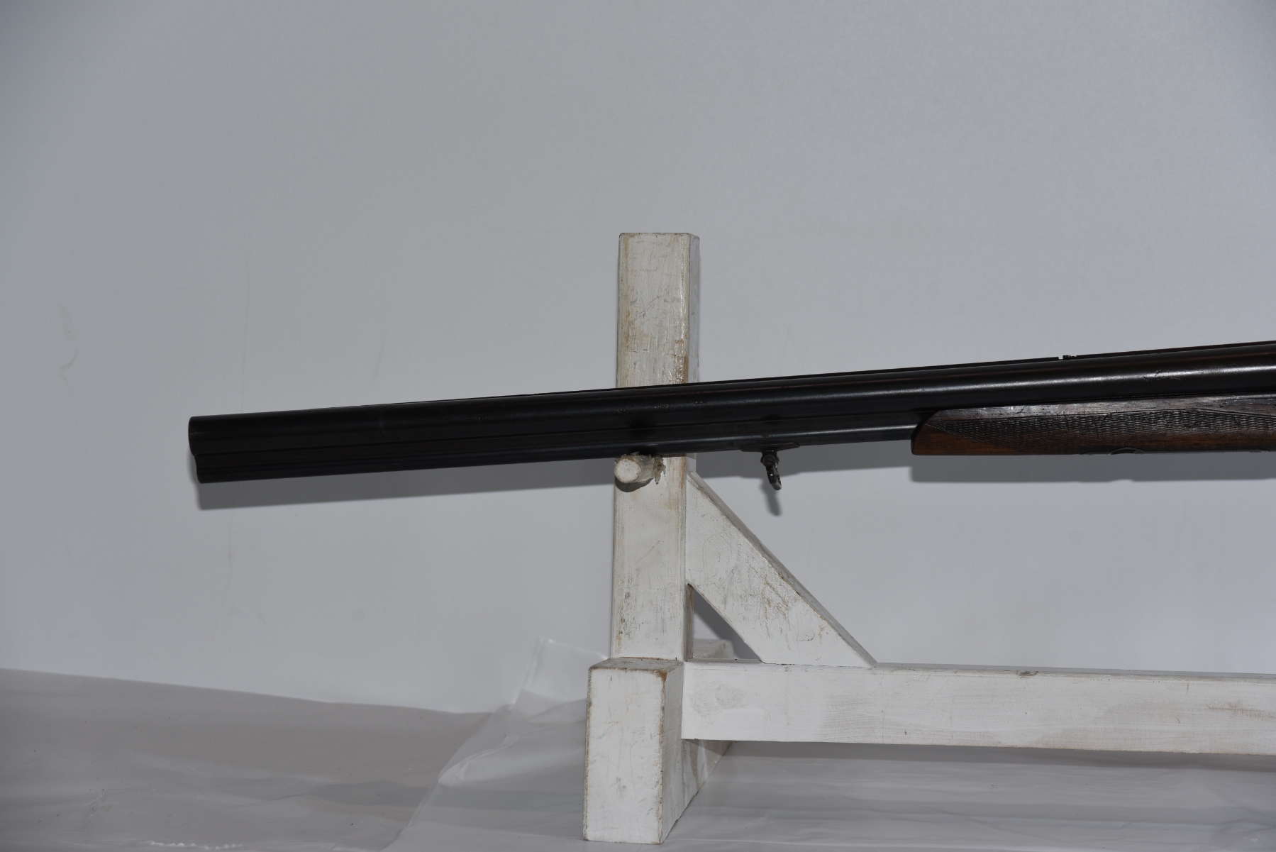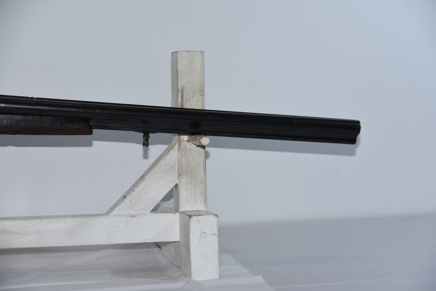 Metal finish shows scratches, small dents on the barrel, front sight is missing, rear sling mount is missing, scuffs, rust spots, pitting in areas, patina, finish wear; condition is less than fair.