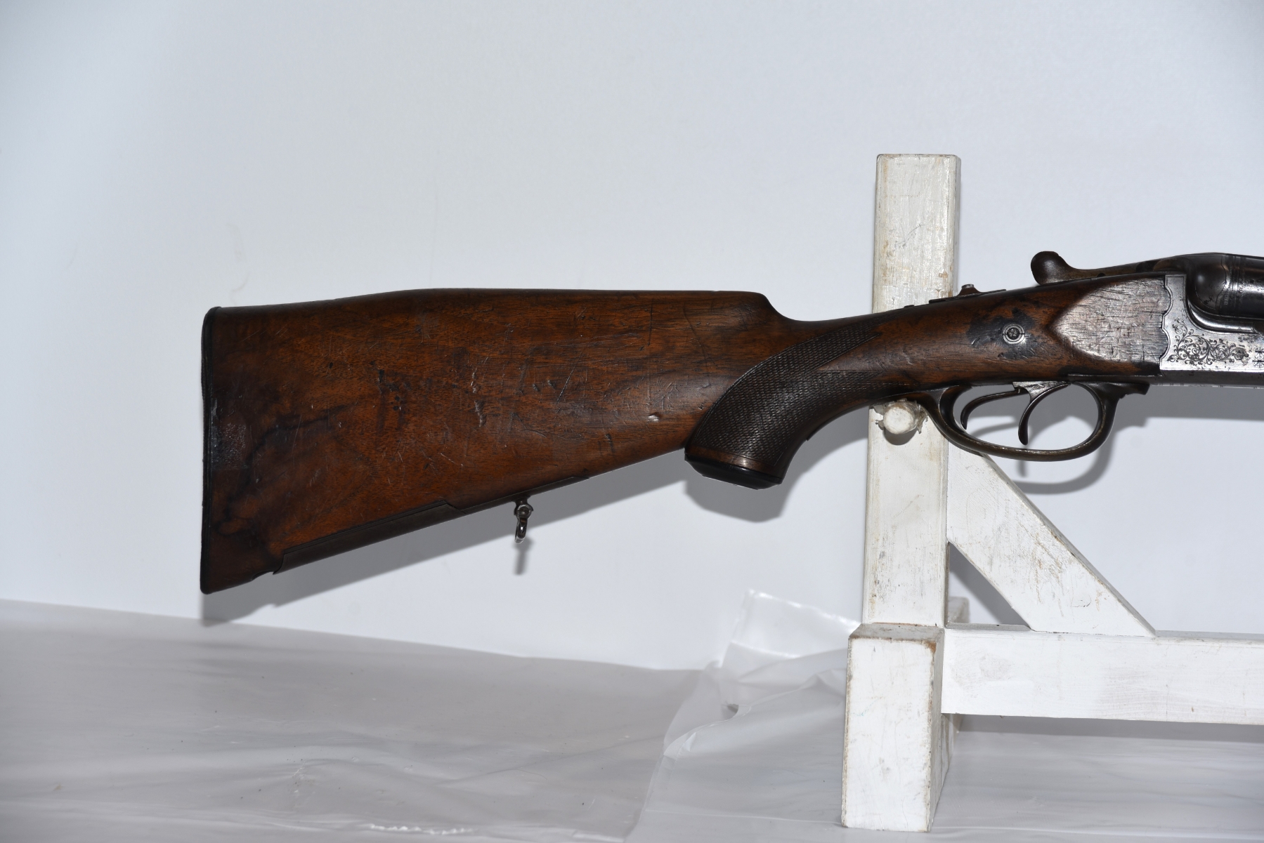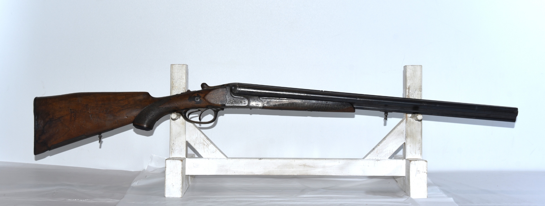 Wood stock shows a repair on the left side of upper tang, dents, scratches, scuffs, tape adhesive in areas; condition is fair.