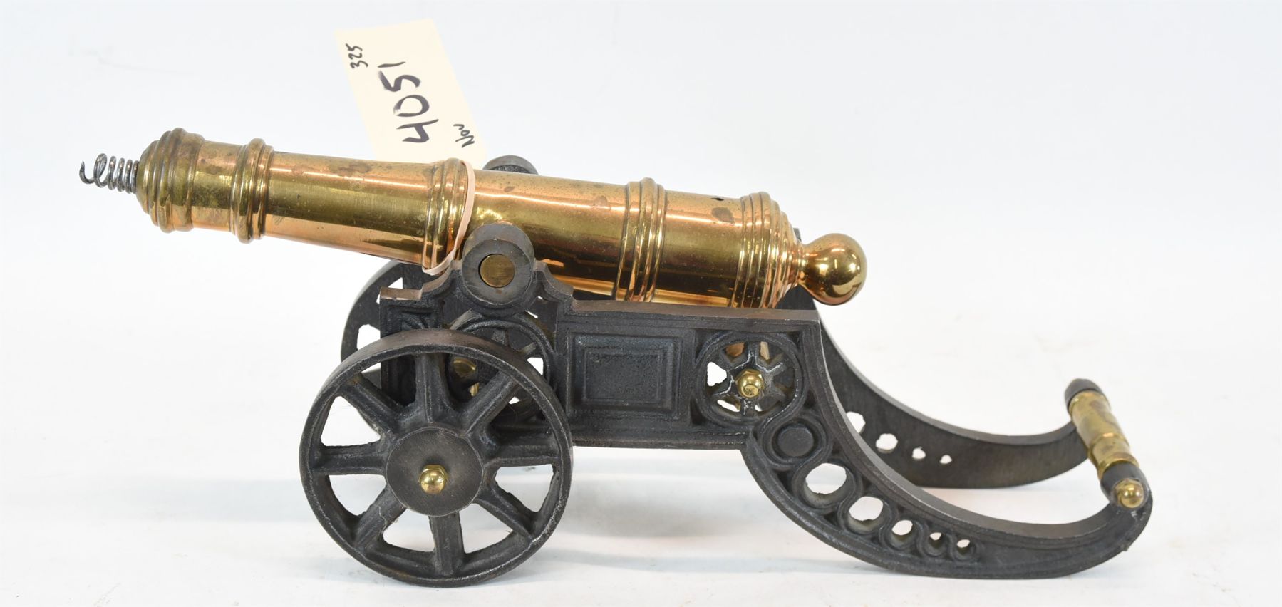 Cannon has a 0.76" bore and the barrel is 9" from the breach to the muzzle. There is a cannon vent for wick. The gun mount is 14" long and 6" high and made of cast iron. Comes with a wooden cleaning rod.
