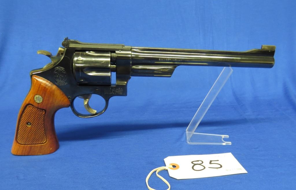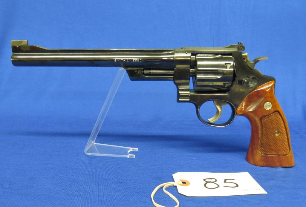 Restricted, revolver, 357 Magnum, 213mm barrel, SN N446750. Wood grips have a scratch, bluing has a bare patch at muzzle, bore excellent.
