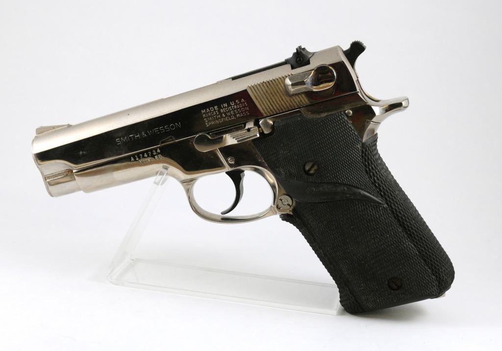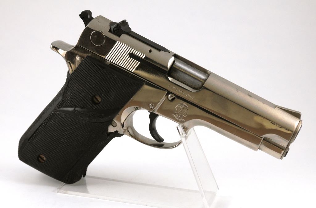 Prohibited, semi auto, 9mm Luger, 102mm barrel, SN A174734. Pachmayer grips have a tear, pitting on nickel plating, bore excellent.