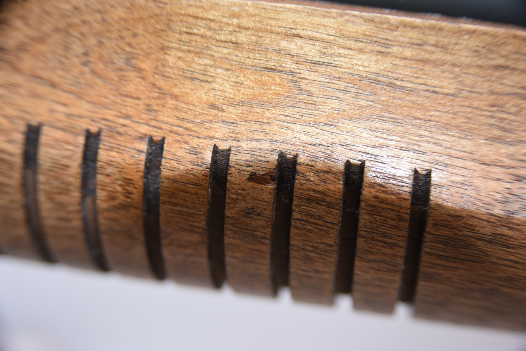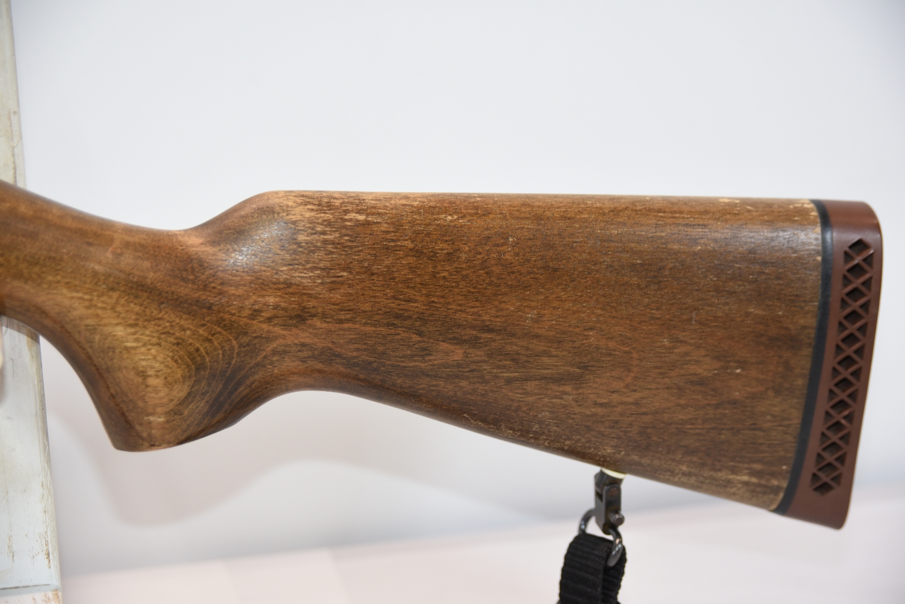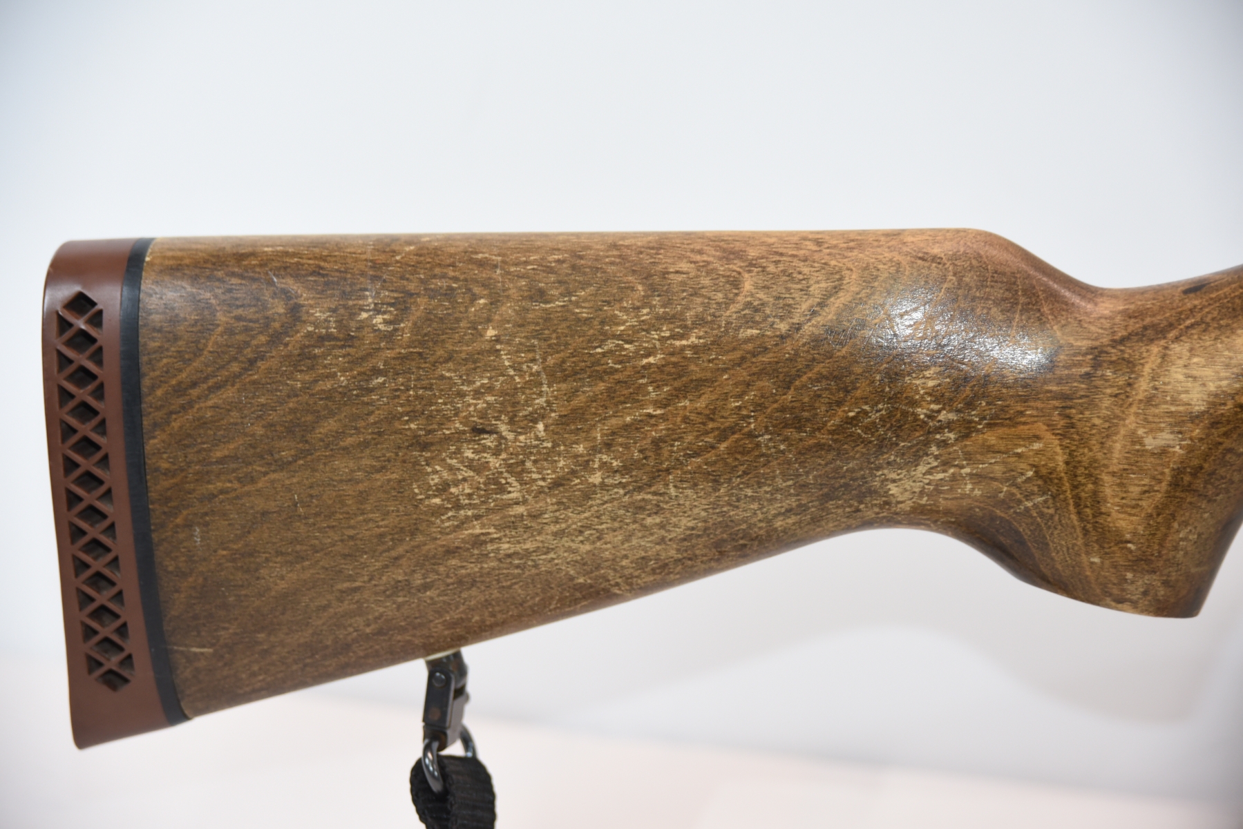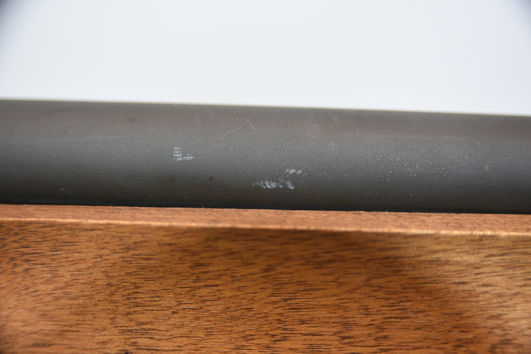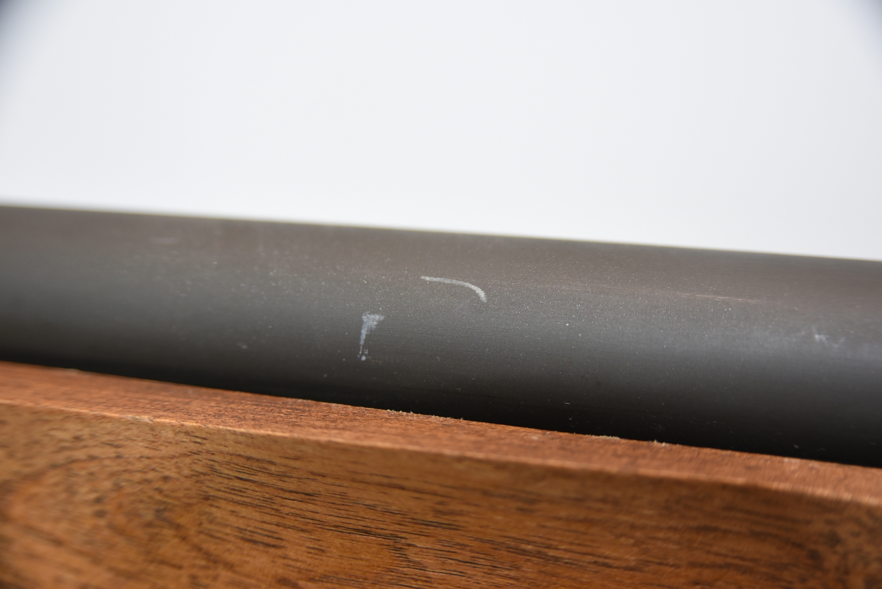 The wooden stock has a number of scratches and scuffs on both sides. The wood on the right hand side of the stock is significantly more worn down than the left hand side with a more dull finish. The wooden forearm has a small chip on the left hand side but is in really good condition overall. The matte bluing on the receiver has a number of scratches on both sides. The matte bluing on the barrel has a number of scratches all throughout as well as a small chip on the tip of the barrel. The bore is shiny, smooth and in good condition. The gun has a sling attached.