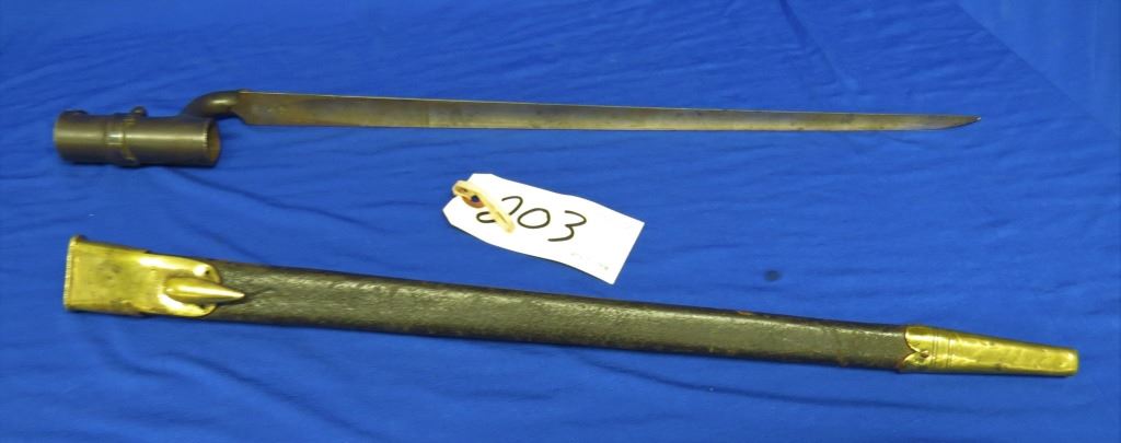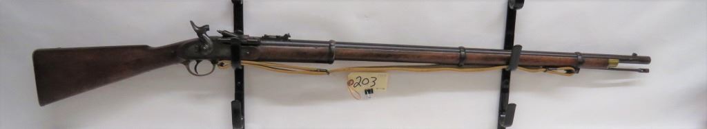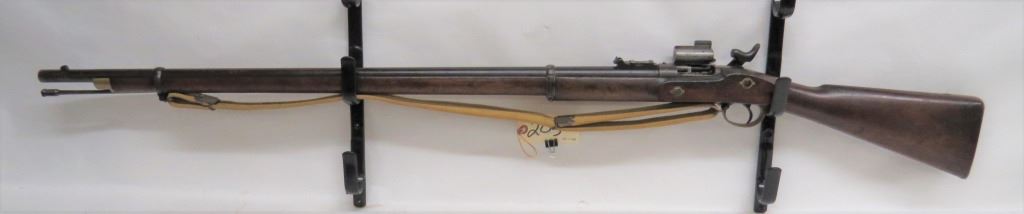 Antique, single shot, 577 Snider, 36 1/2" barrel, SN none, wood has handling marks, bluing is brown, bore is very good, comes with bayonet , canvas sling and cleaning rod, three band rifle