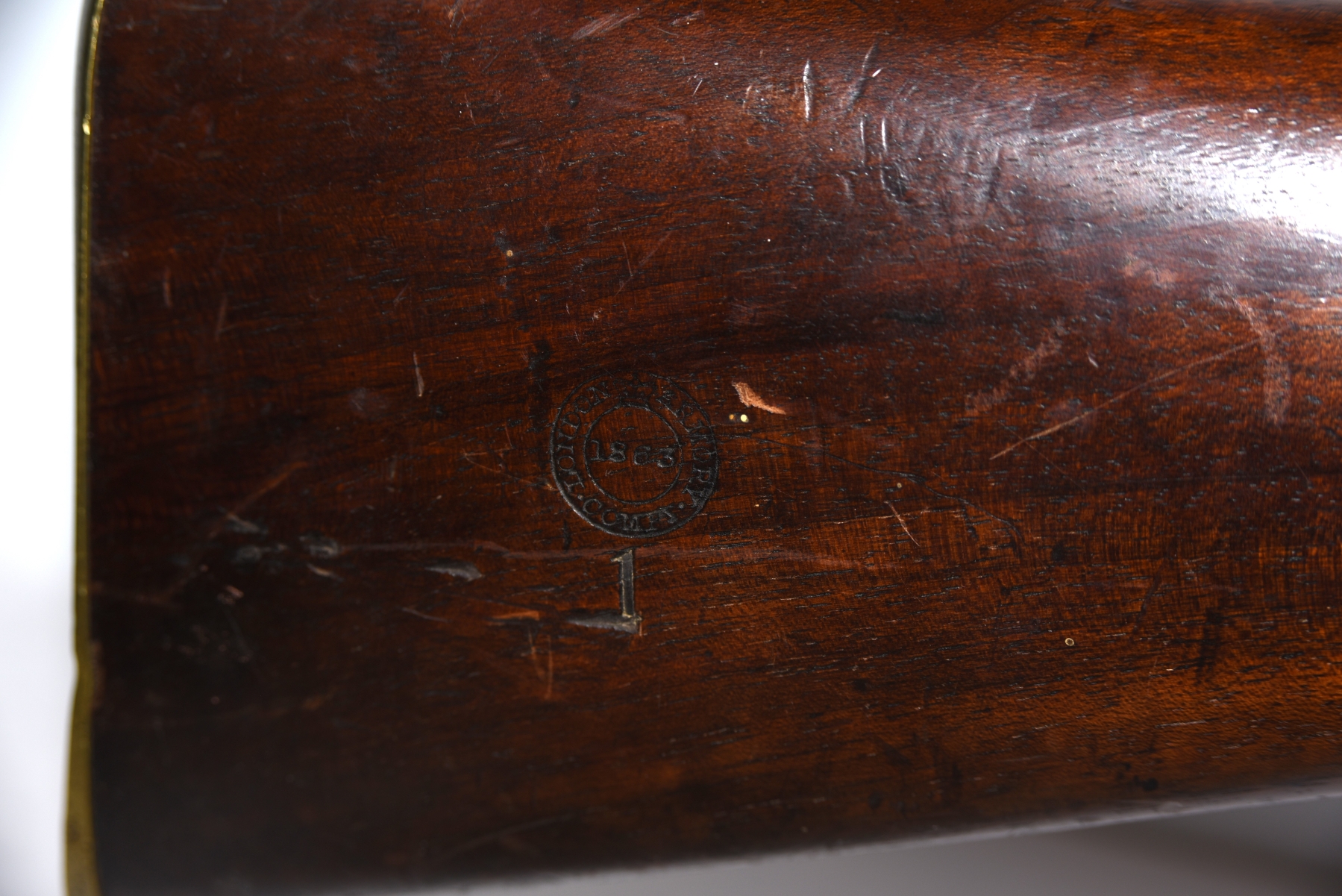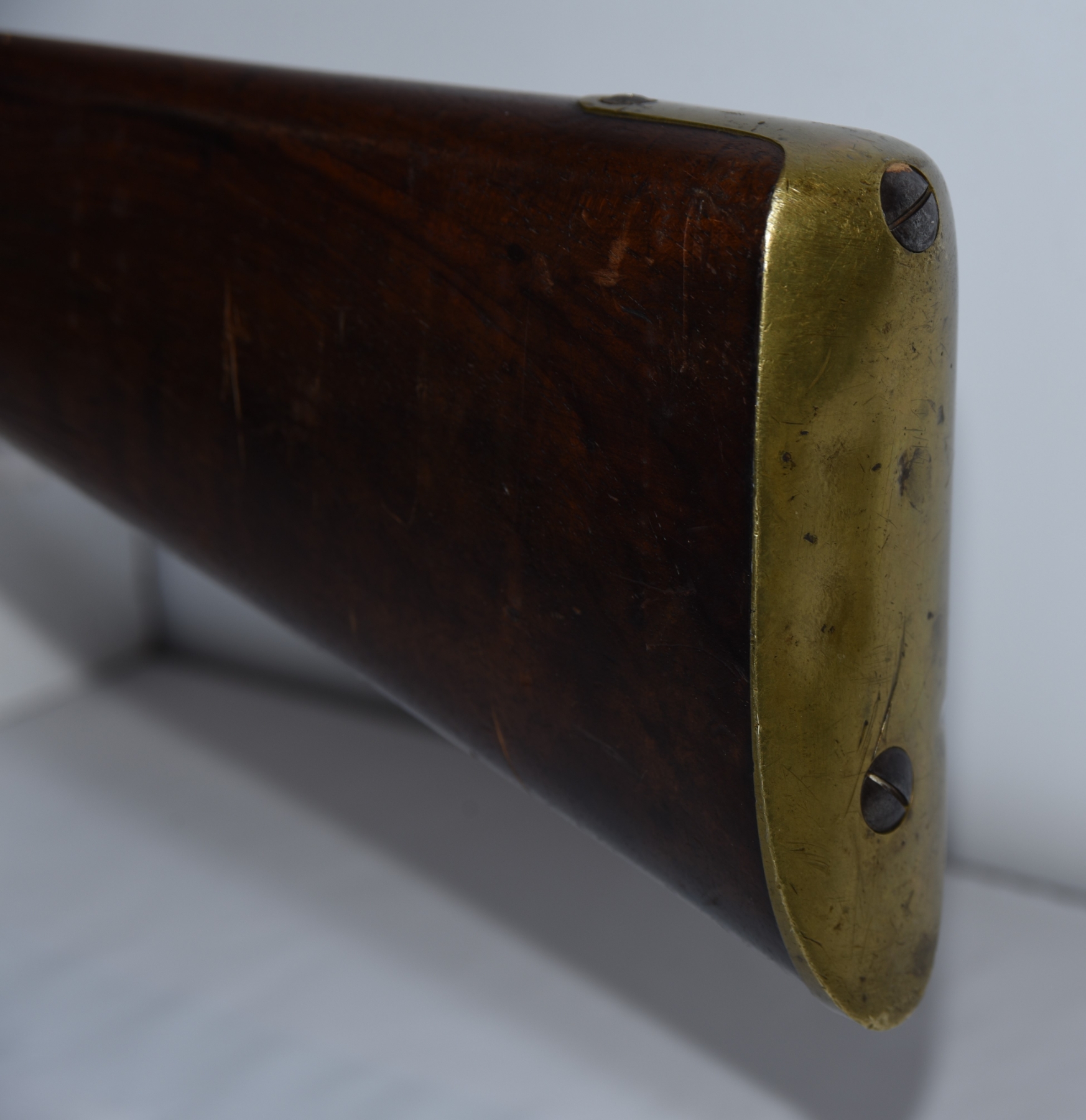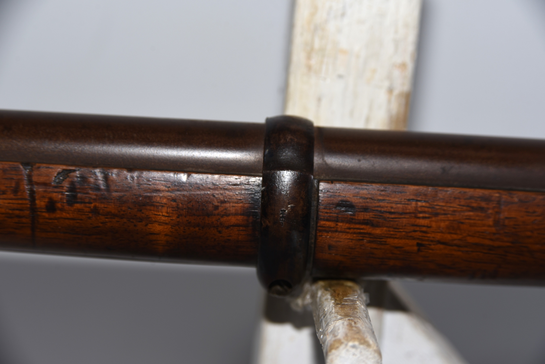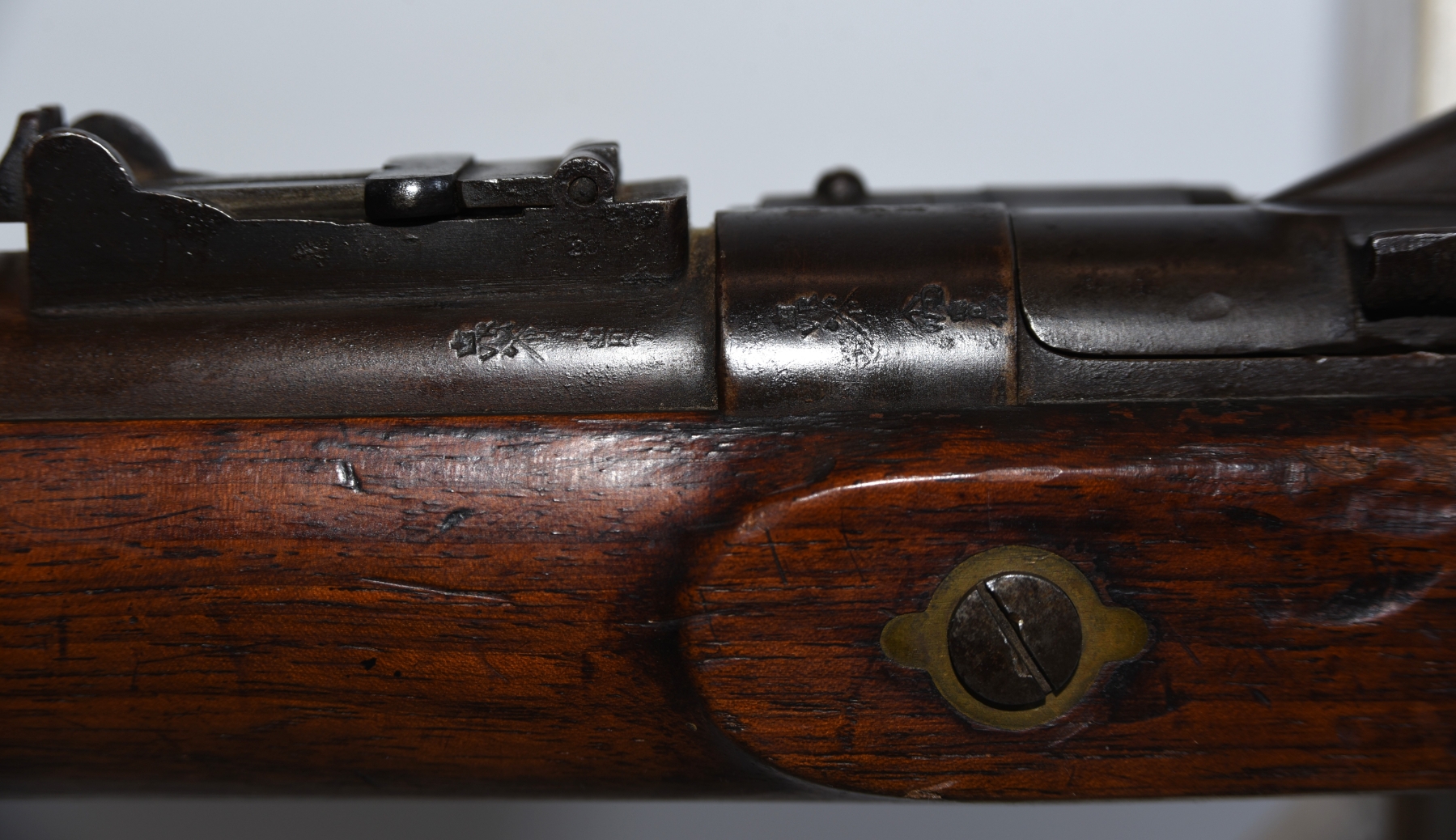 Wood shows scratches, scuffs, dents, few small chips, there are markings on the stock; condition is good for age.