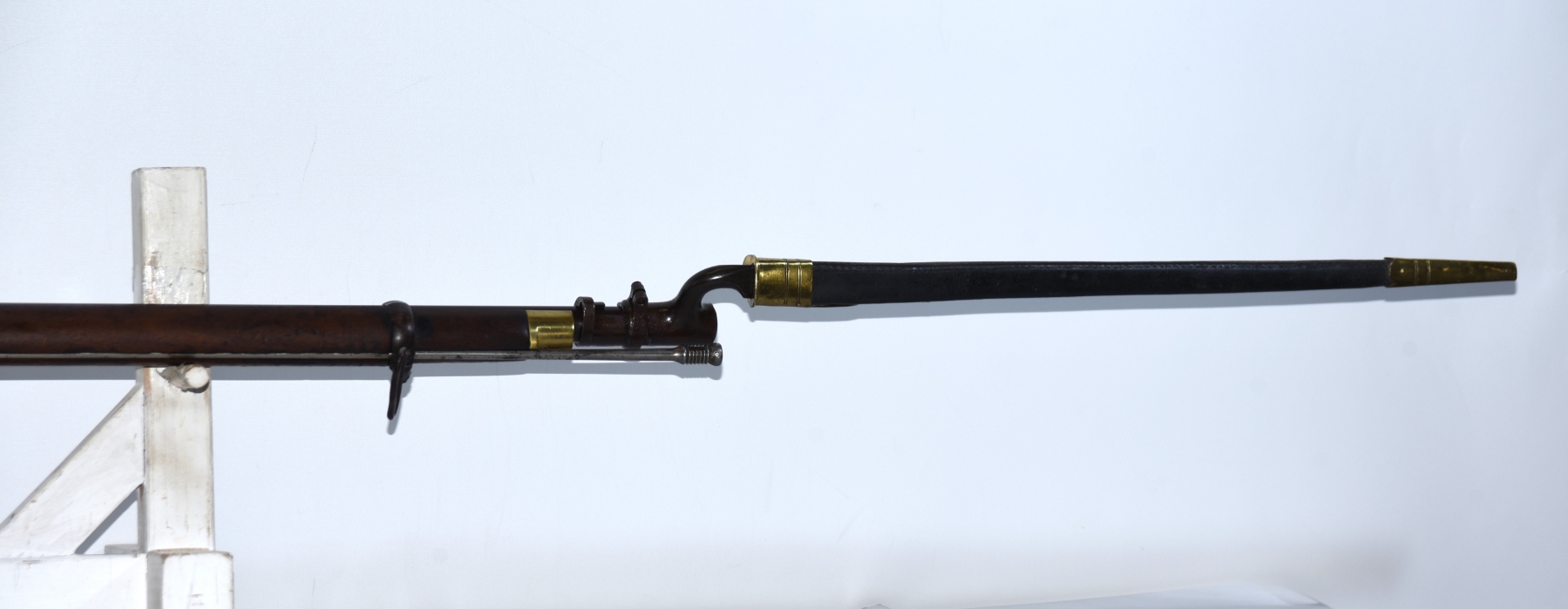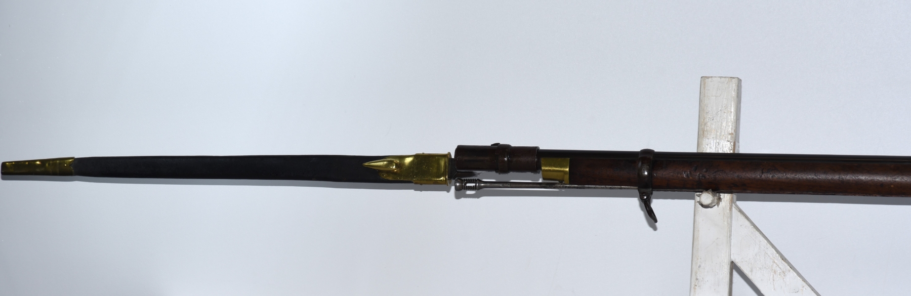 Bayonet shows scuffed leather, rust in areas, light pitting; condition is good.