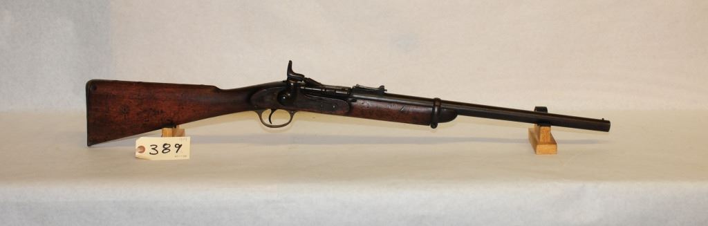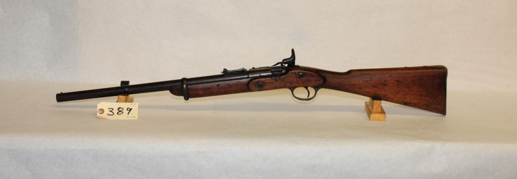 Antique, single shot, 577 Snider, 19" barrel, SN none. Wood has numerous dents and marks, bluing is brown, bore pitted, rifling prominent.