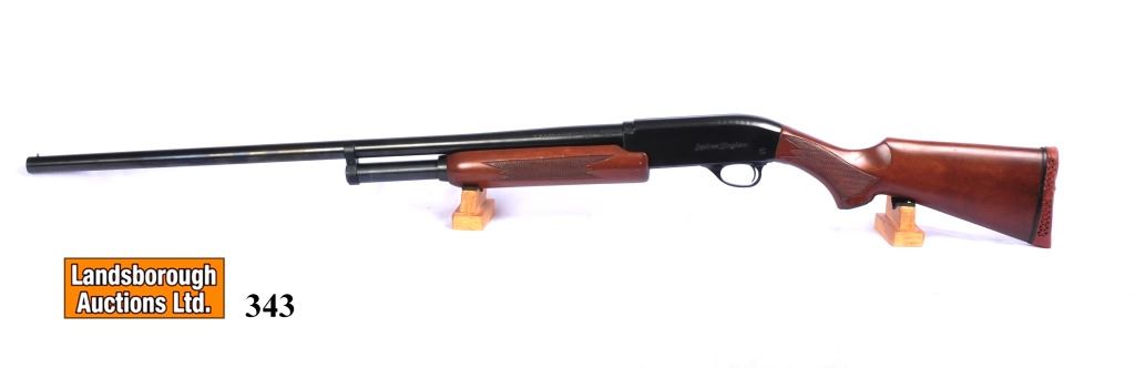 Non-Restricted, pump action, 12ga x 2 3/4", 30" barrel with fixed full choke, SN A453875. Wood has some marks, bluing good, bore excellent. Recoil pad crushed.