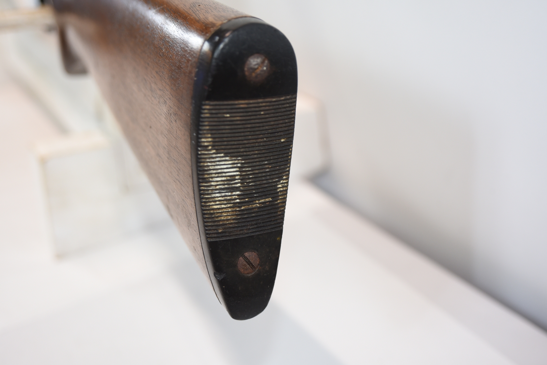 Wood stock shows scratches, scuffs, few paint spots, dents; condition is fair.