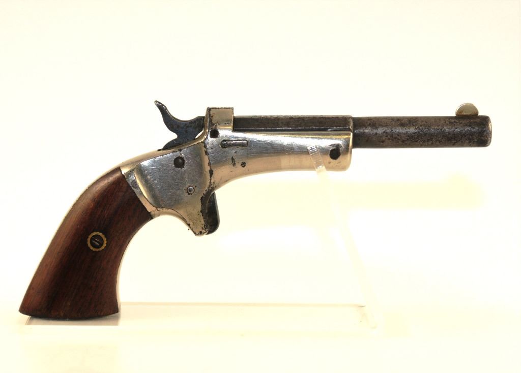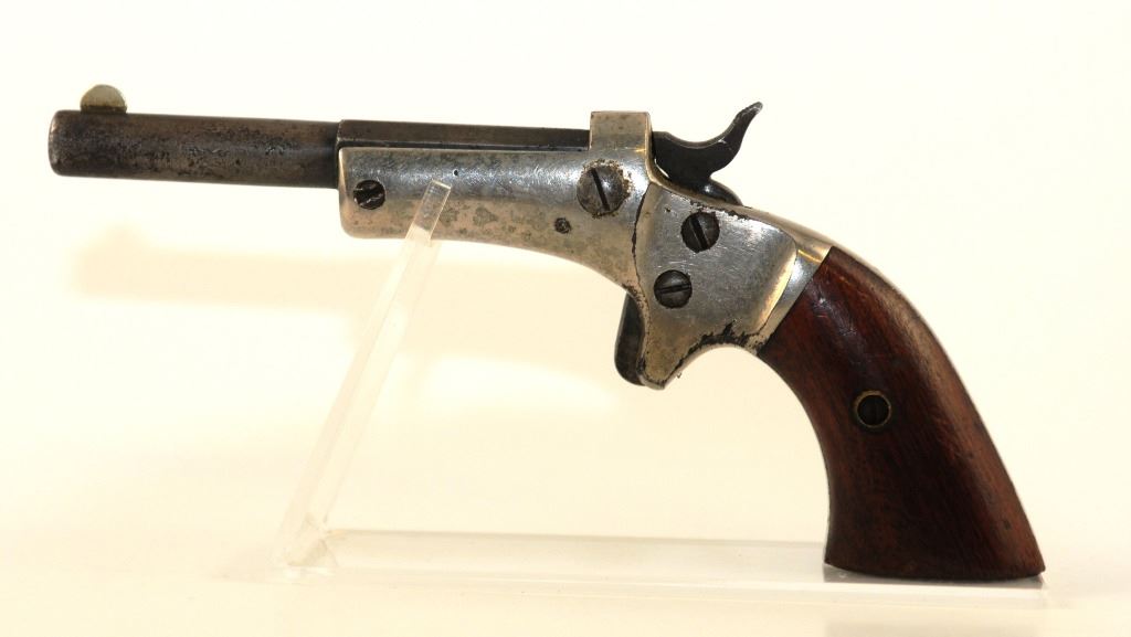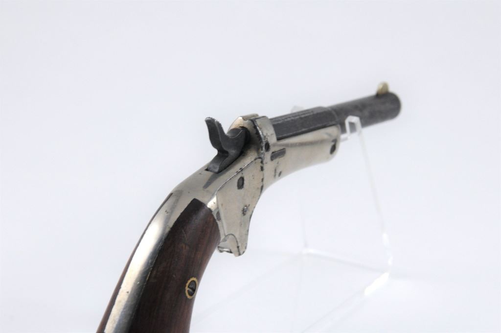 Prohibited, Single Shot, 22 Short, 89mm barrel, SN 62873. Wood grips have light scratches, nickel plating tarnished and pitted, bluing is brown, bore badly pitted.