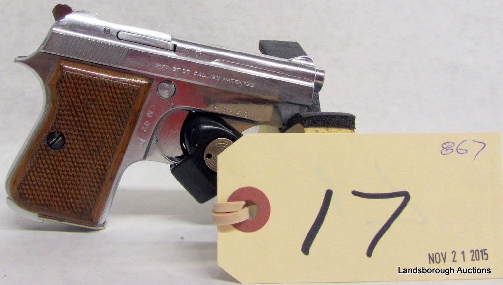 PROHIBITED, SEMI AUTO, 25 AUTO, 63MM BARREL, SN B95598. WOOD GRIPS GOOD, CHROMED METAL FINISH HAS SOME SCRATCHES, BORE HAS SOME PITTING.