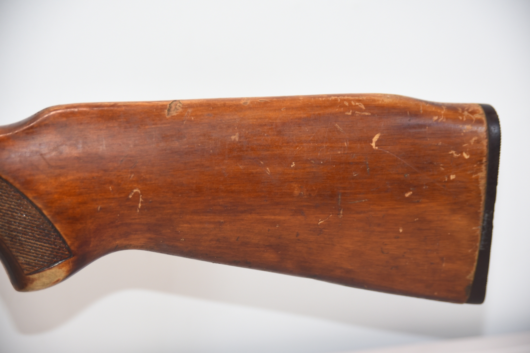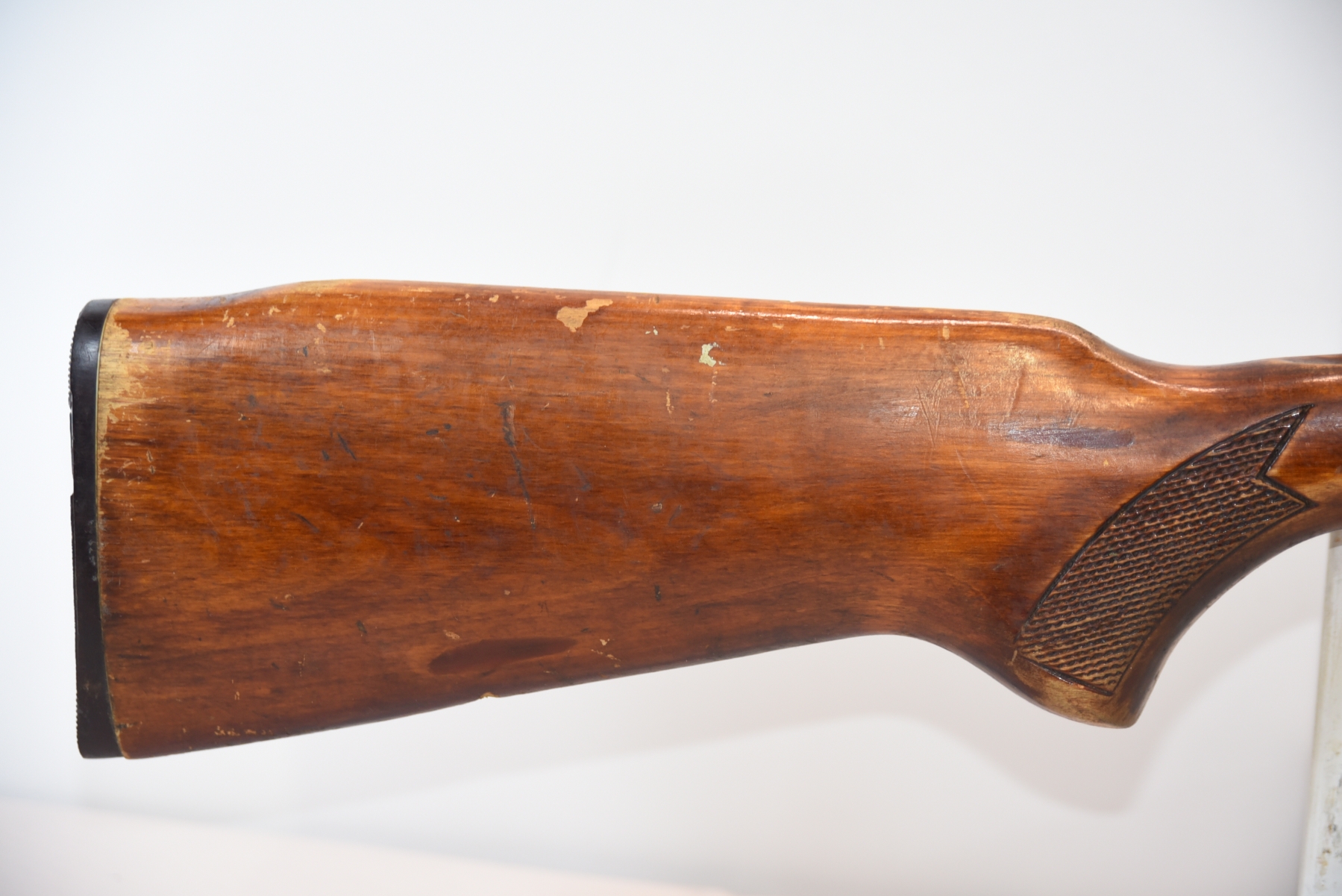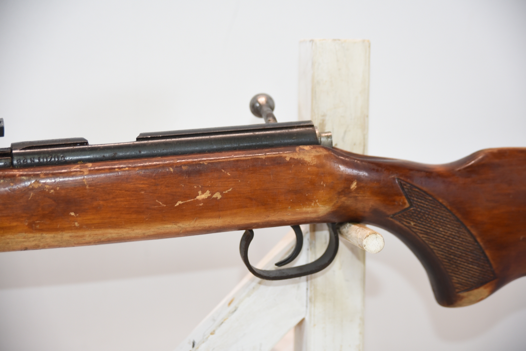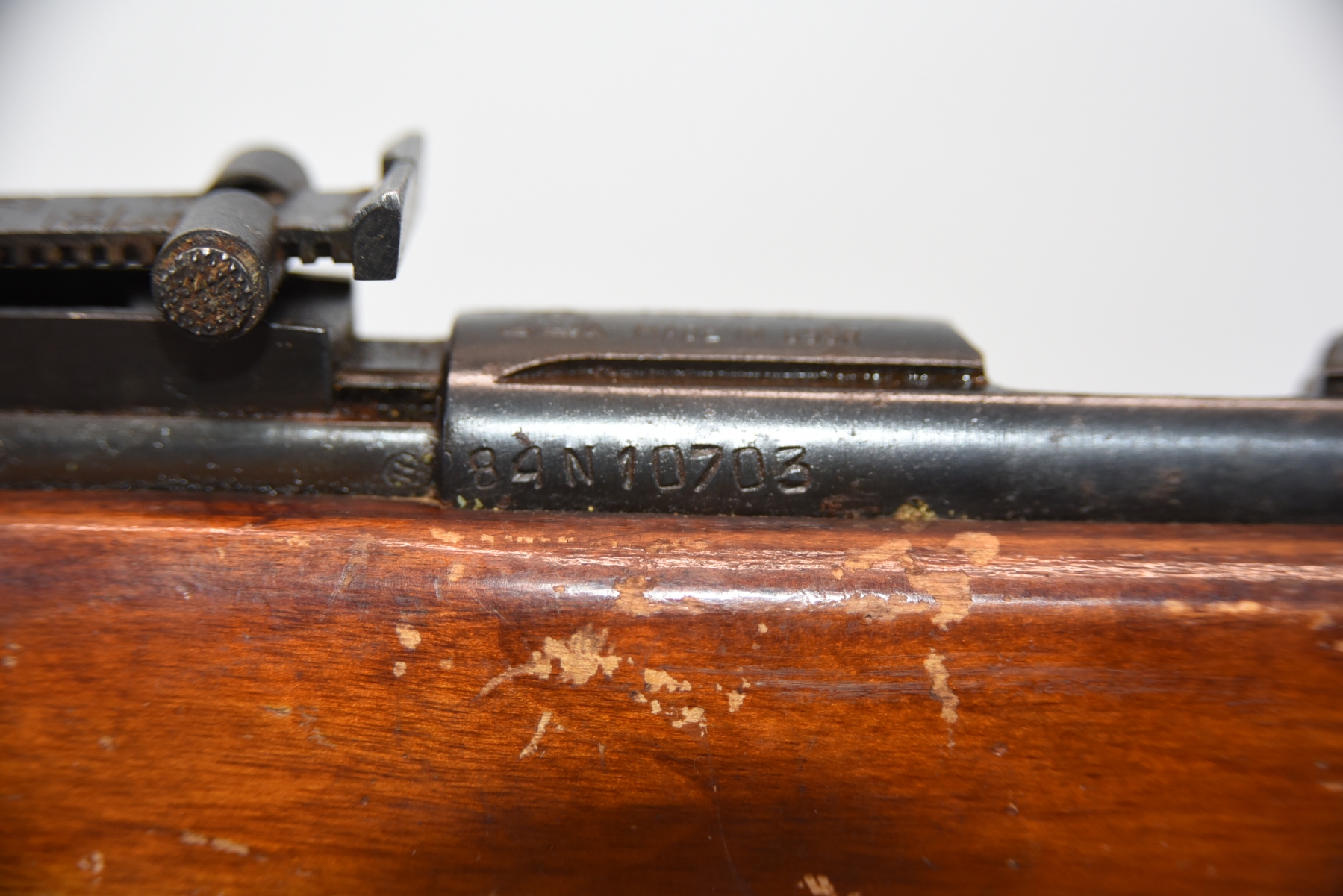 Metal finish shows rust spots in areas with scratches and scuffs, missing the rear cap on the receiver; condition is fair.