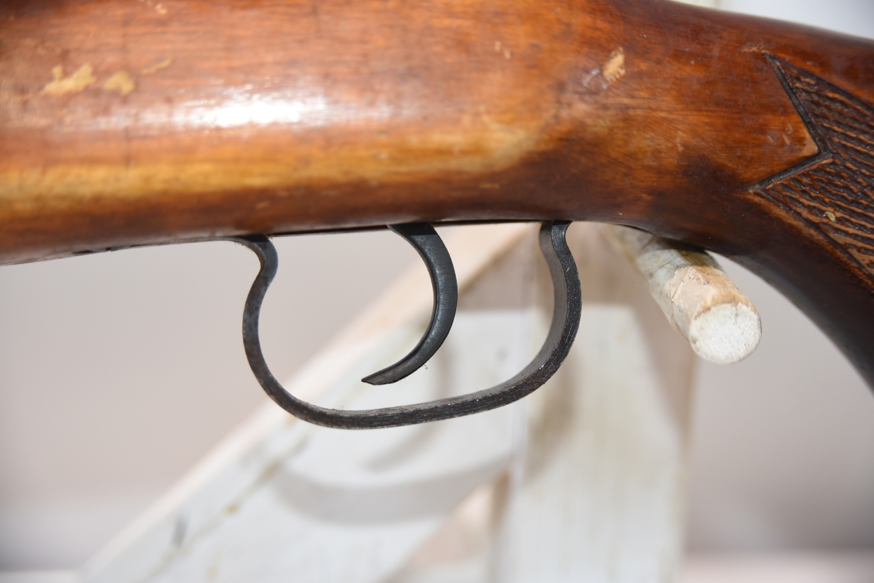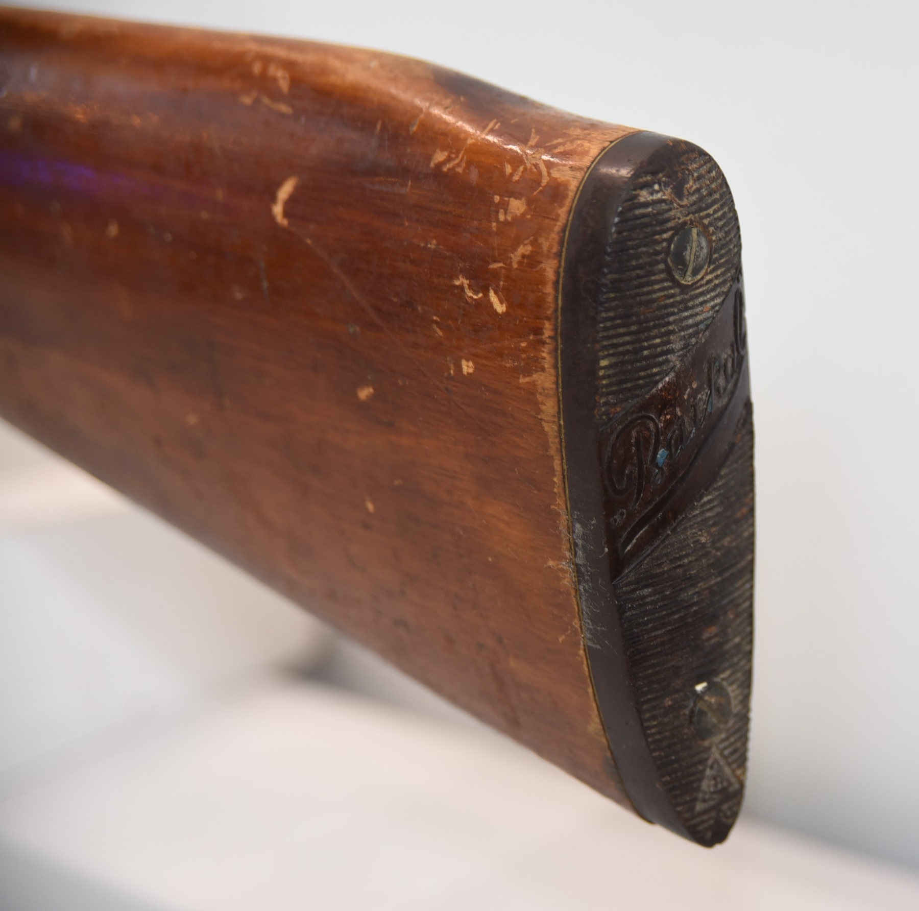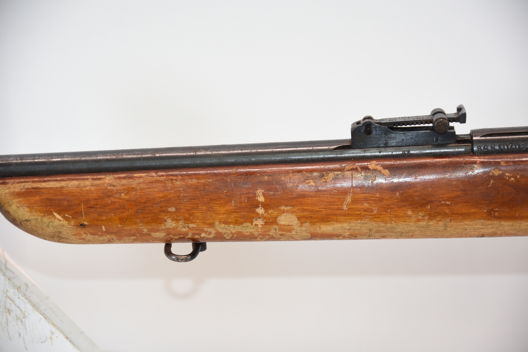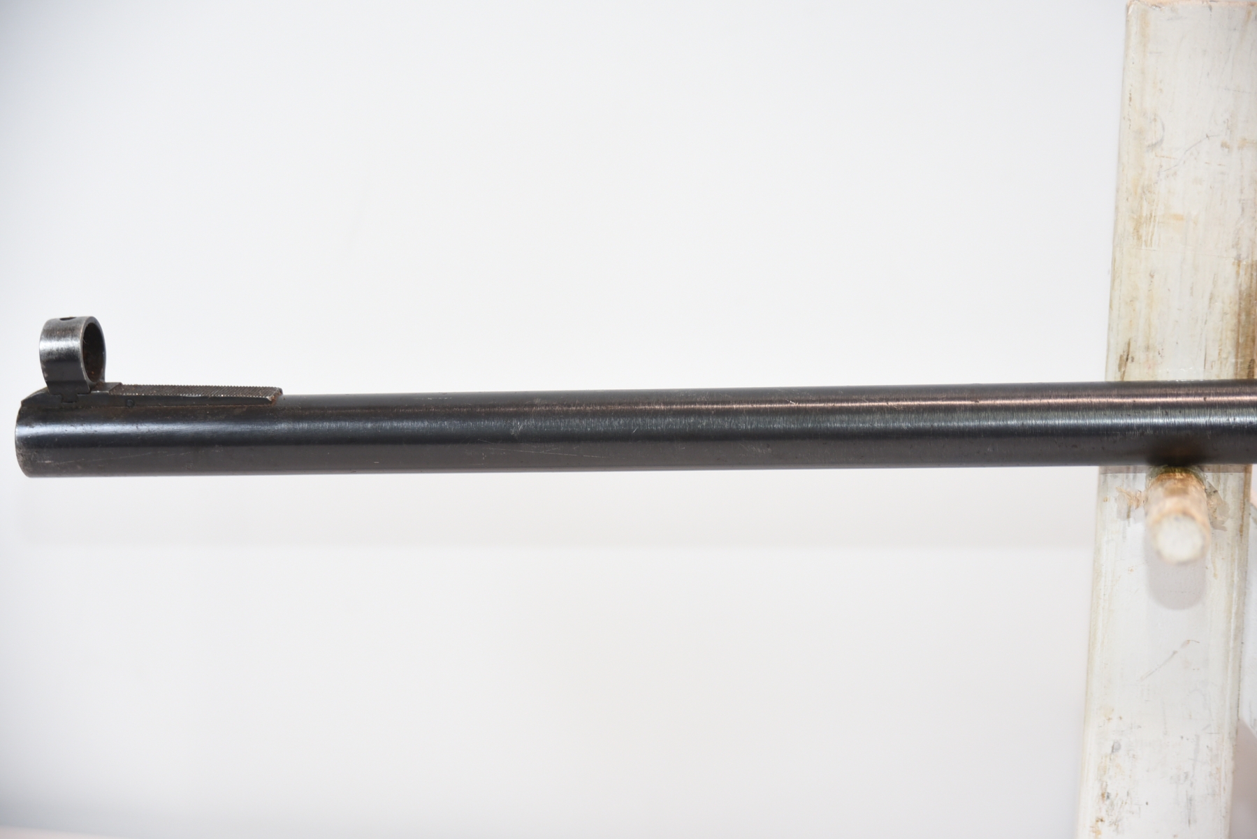 Metal finish shows rust spots in areas with scratches and scuffs, missing the rear cap on the receiver; condition is fair.