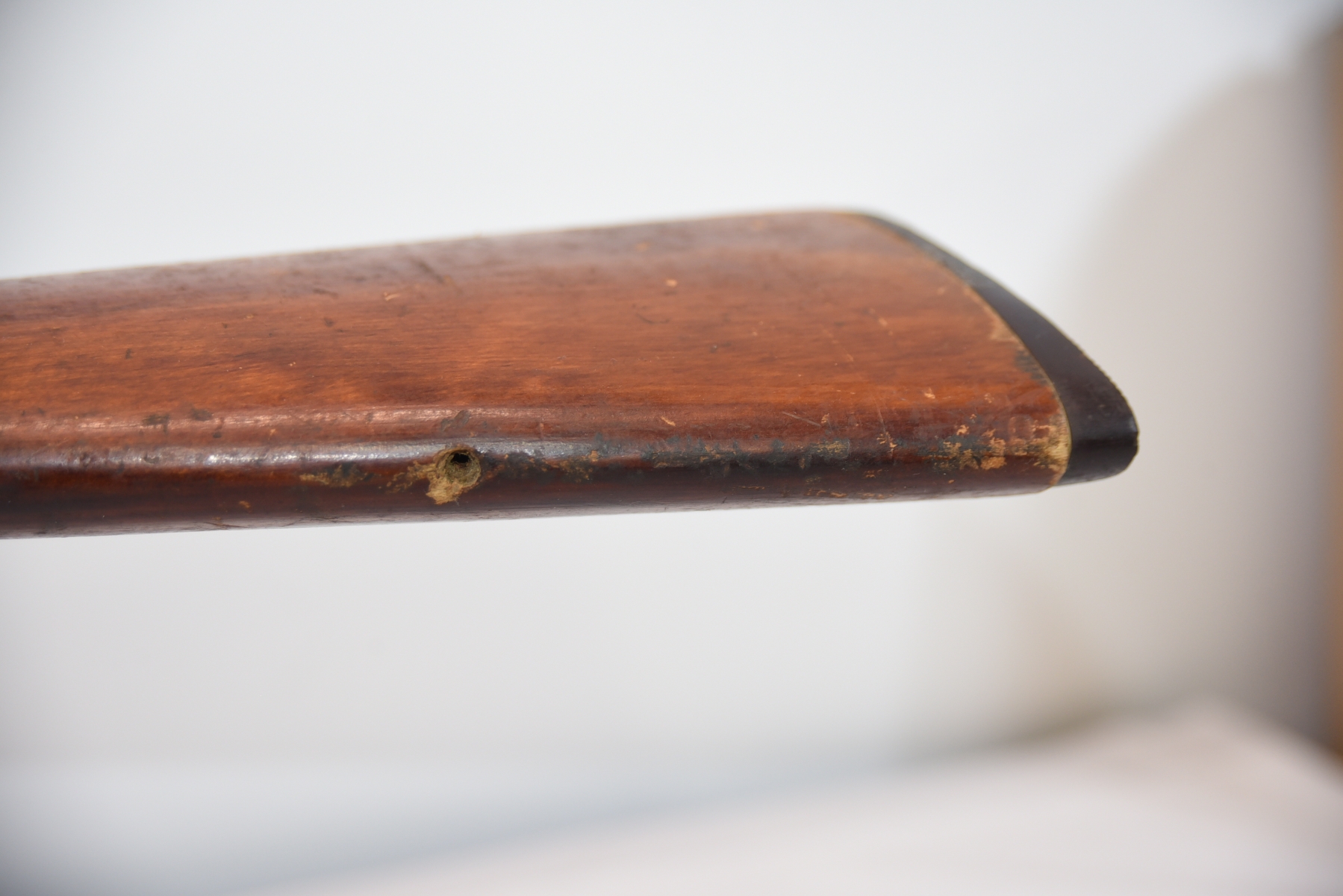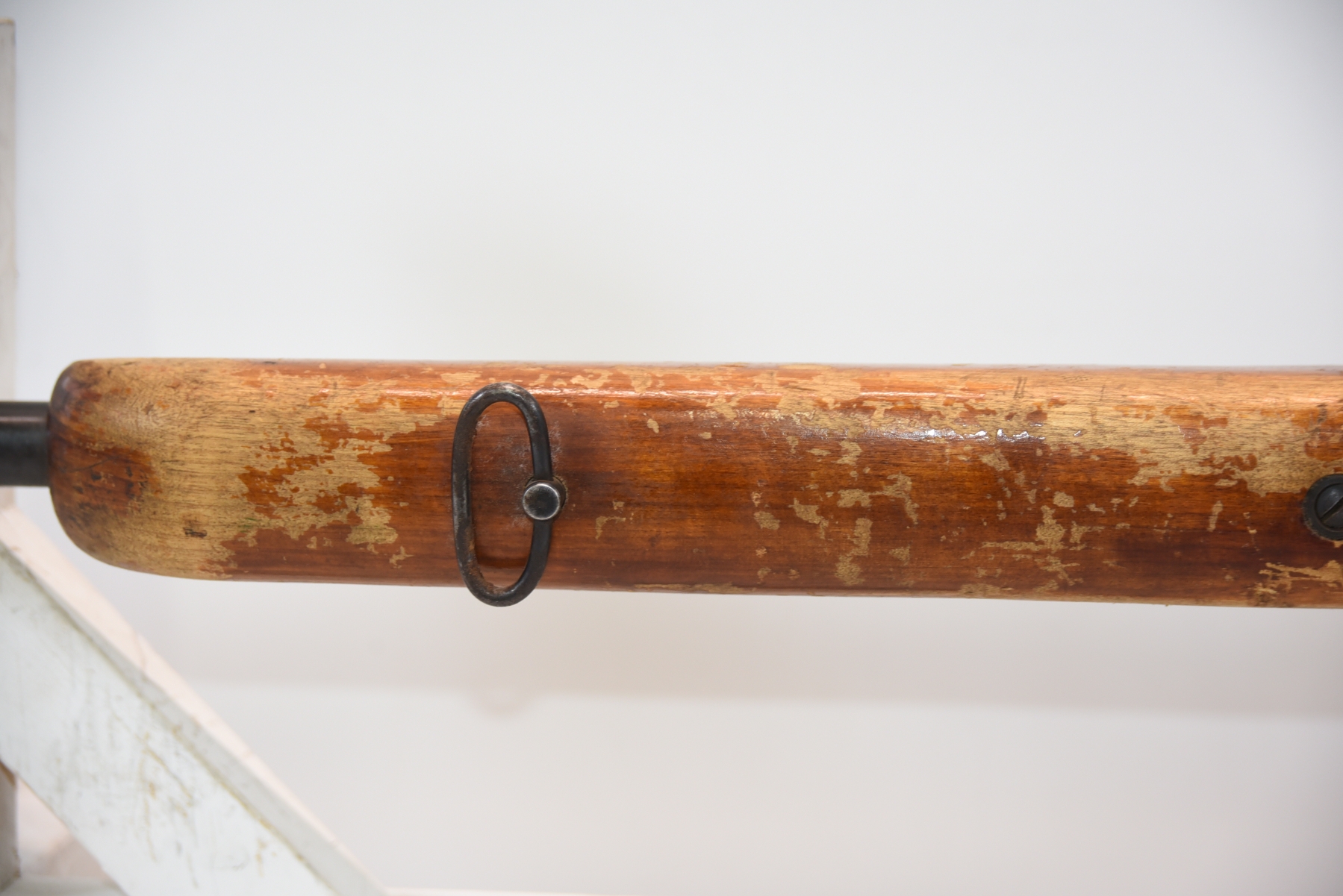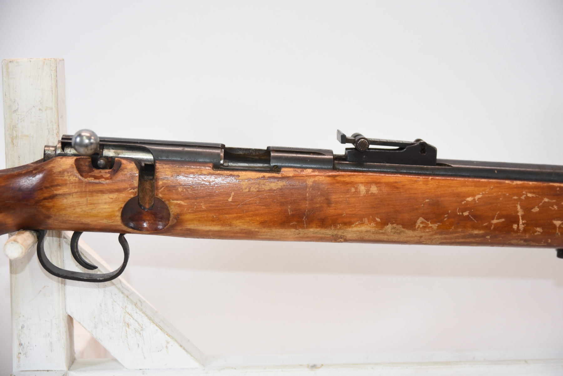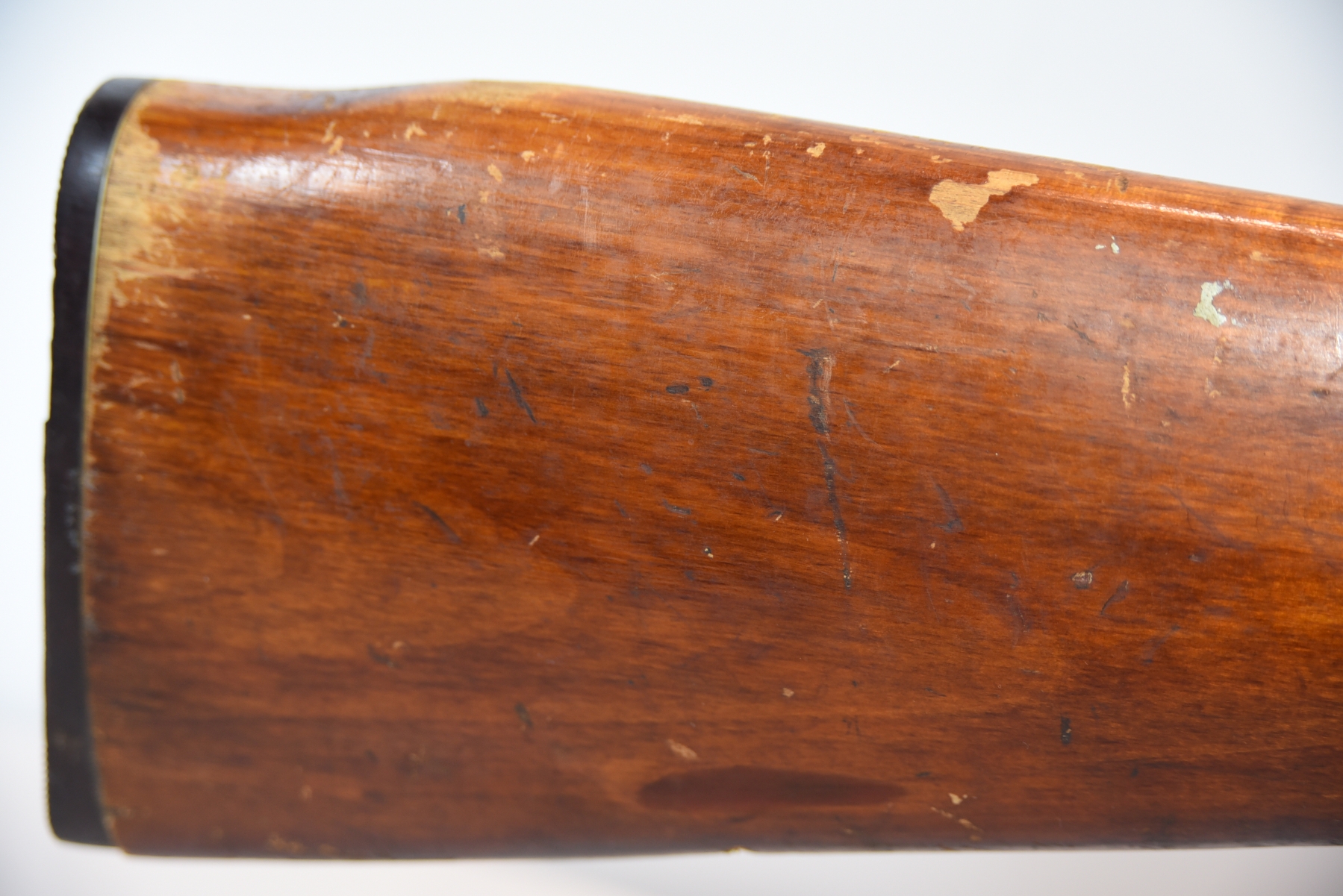 Wood stock shows missing rear sling swivel, scratches, scuffs, light dents, finish wear; condition is fair.