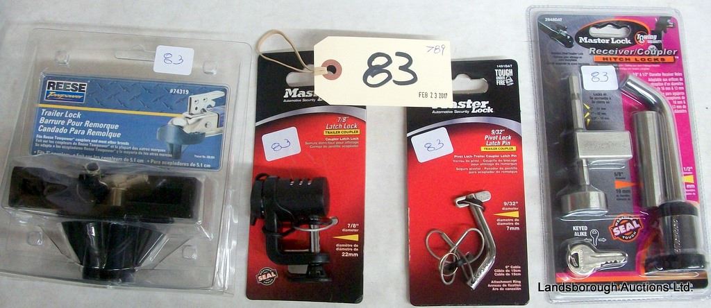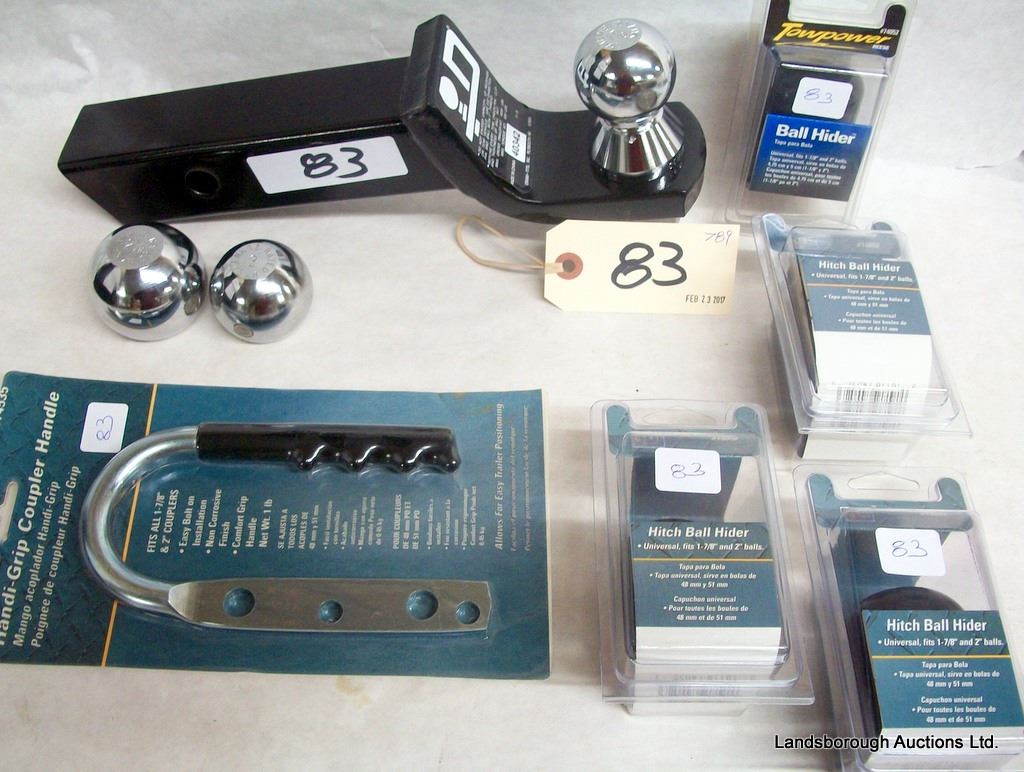 DRAW TITE INTERCHANGABLE BALL 1 7/8, 2, 2 5/16 INCH; FOUR BALL HIDER FOR 1 7/8 AND 2 INCH; REESE HANDI GRIP COUPLER AND TRAILER LOCK FOR 2 INCH, MASTER LOCK LATCH PIN FOR 9/32 DIA AND LATCH LOCK; MASTER LOCK RECEIVER LOCK 1/2 IN PIN.