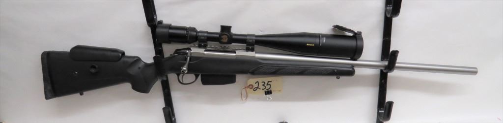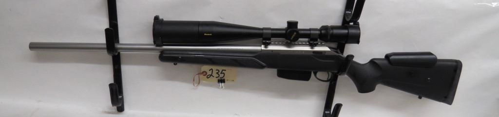 Non-retsricted, bolt action, 22-250 rem., 24" heavy barrel, SN D28421, synthetic stock has just a few minor handling marks, stainless steel matte finish barrel and action are in very good condition, bore is excellent, comes with a Nikon Monarch 6-24x50 scope.