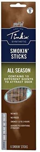 Tink's Smokin' Sticks All Season Sku W6105BL Light and allow the smoke to travel downwind. The scent-infused smoke adheres to everything it comes in contact with leaving a scent trail right to your stand.