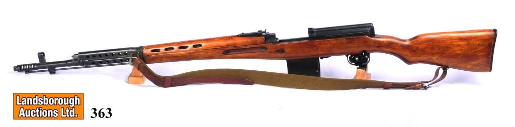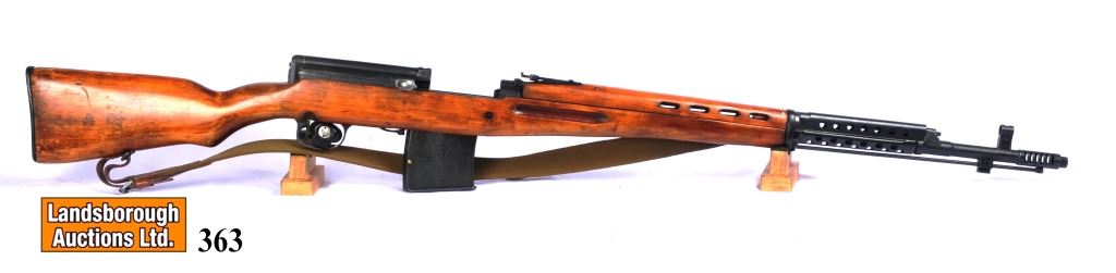 Non-restricted, semi auto, 7.62 x 54R, 24" barrel, SN AK1026. Wood original with numerous scratches, bluing grey with pitting, bore dark with prominent rifling.