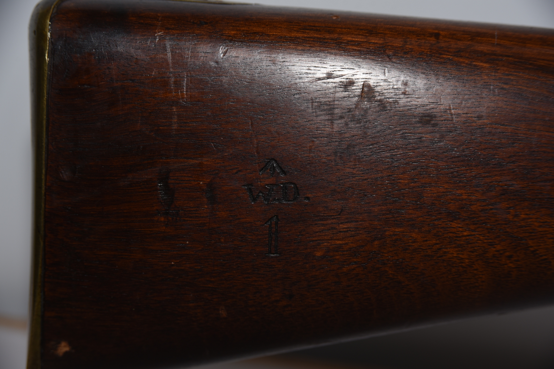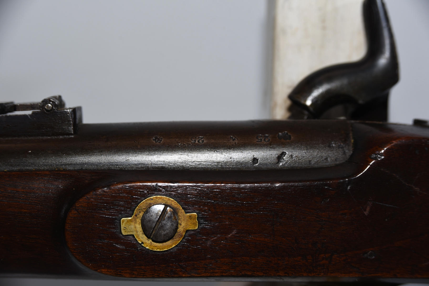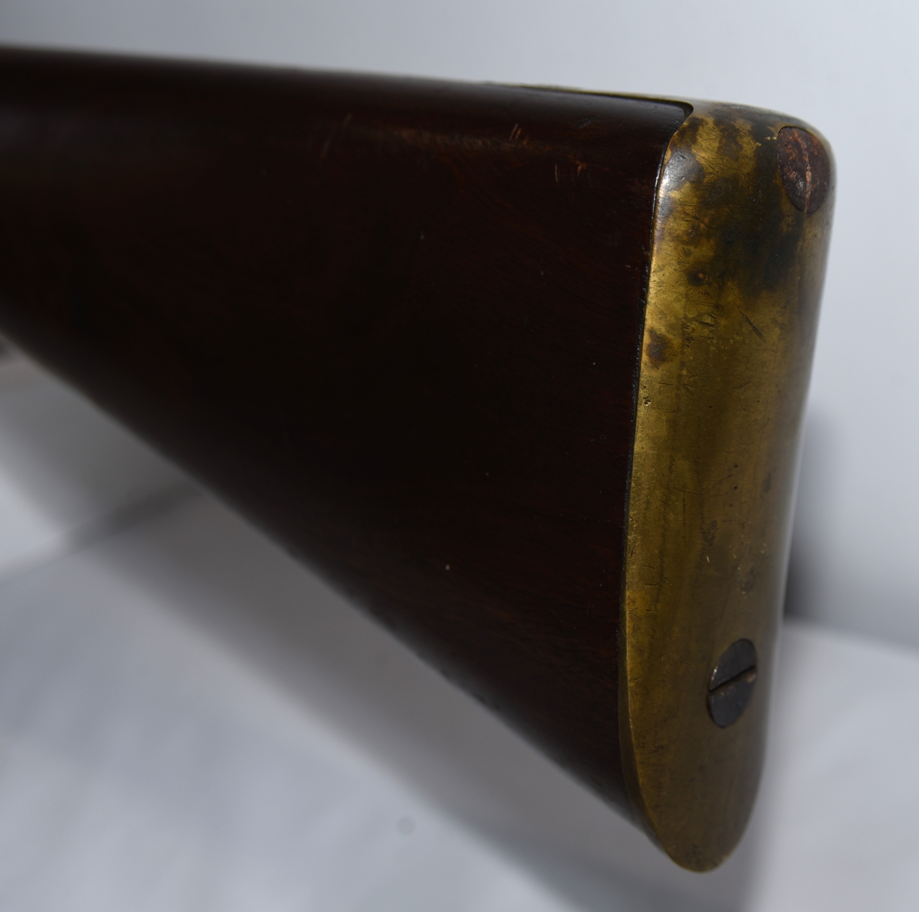 Wood finish shows scratches and scuffs, dents, fine crack on left side of the upper tang, few light tiny chips; condition is good for age.