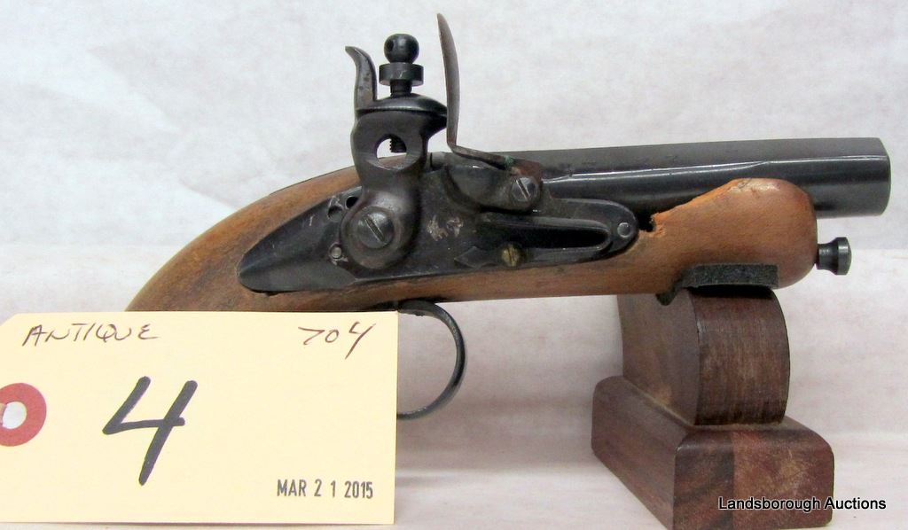 ANTIQUE, SINGLE SHOT, 36 FLINTLOCK, 95MM BARREL, SN 13033. WOOD HAS LARGE PIECE MISSING, BLUING SCRATCHED, BORE RUSTY.