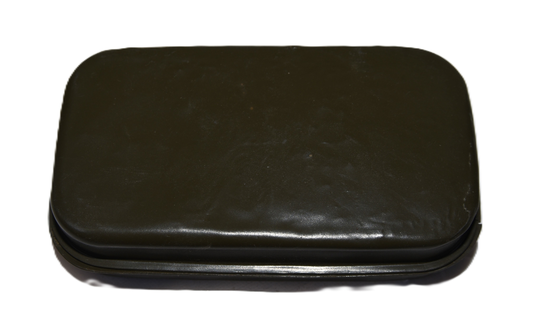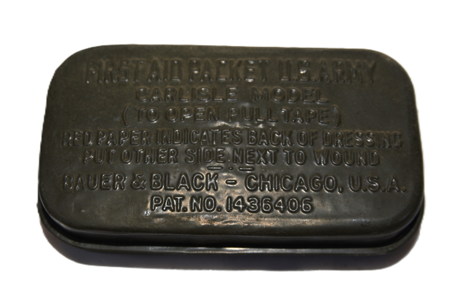 WWI U.S. Army Carlisle First Aid Packet Tin – This style represents the standard U.S. Army first aid packet container used during the late WWI period and into the interwar years, prior to WWII updates. Condition is very good for its age, showing light surface wear, minor finish loss, and handling marks, but no major dents or structural issues. Lid appears intact and closes properly; contents not inspected.