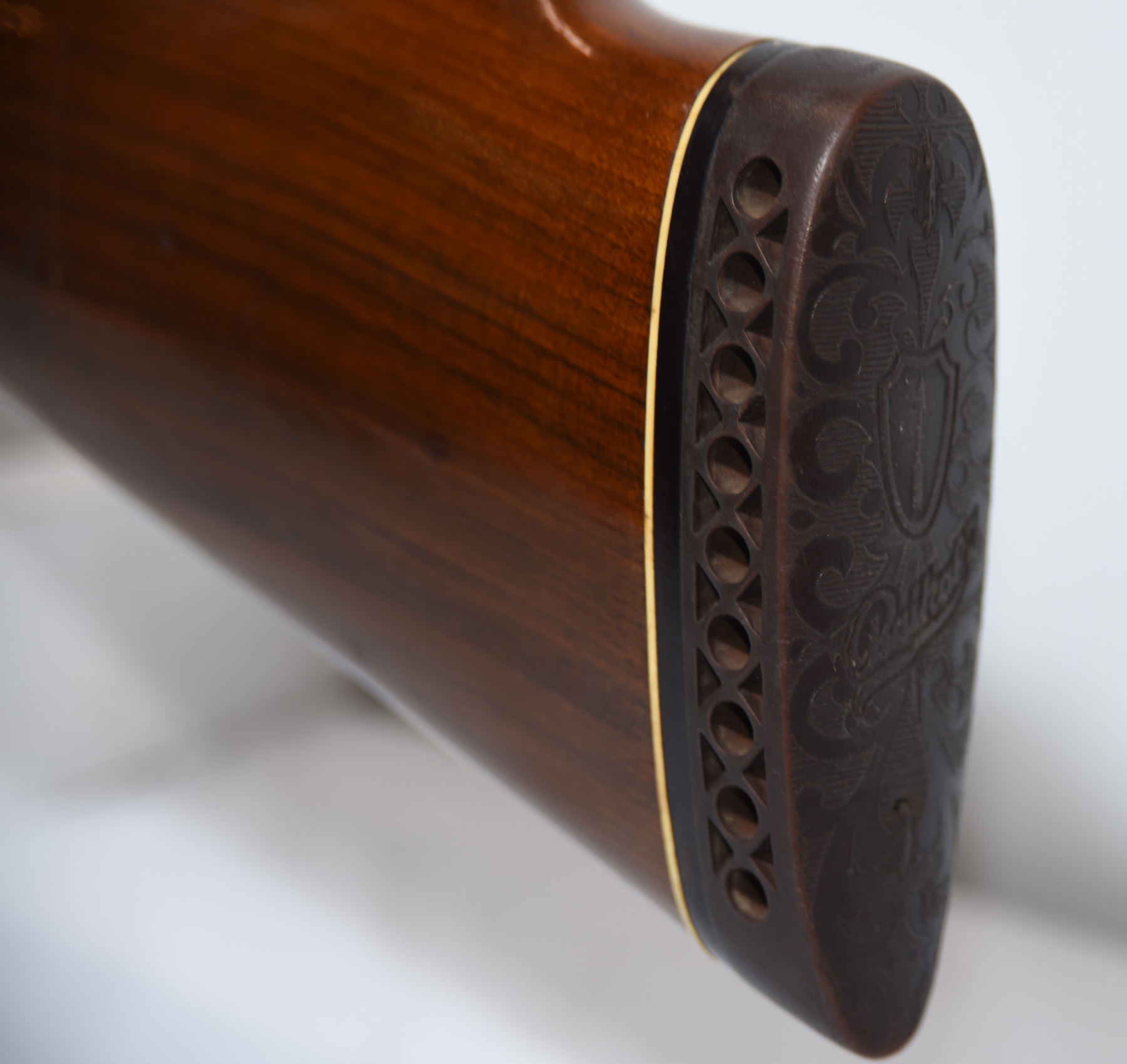 Wood stock shows scratches and scuffs, light dents, fine hairline crack on the upper tang area; condition is very good.