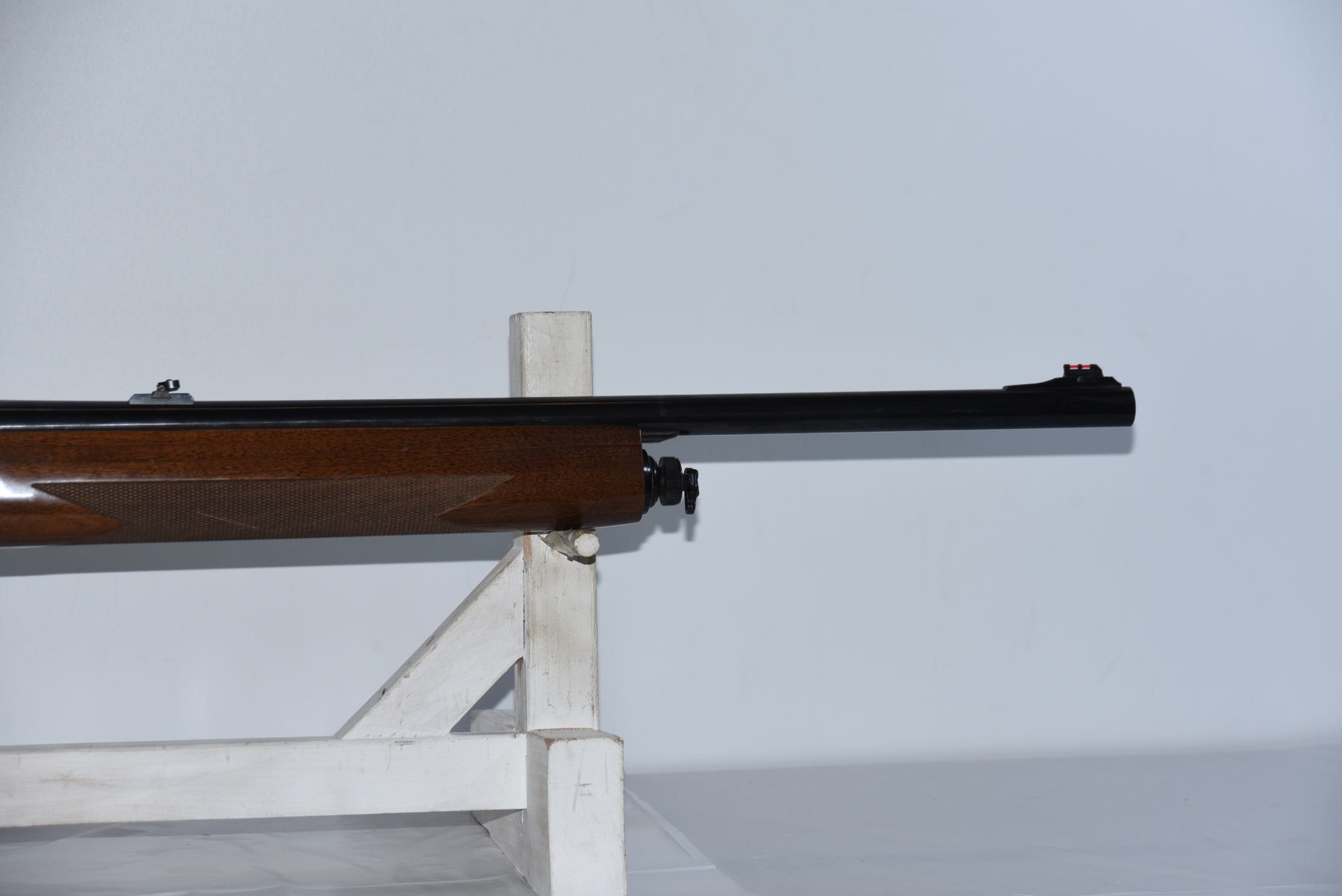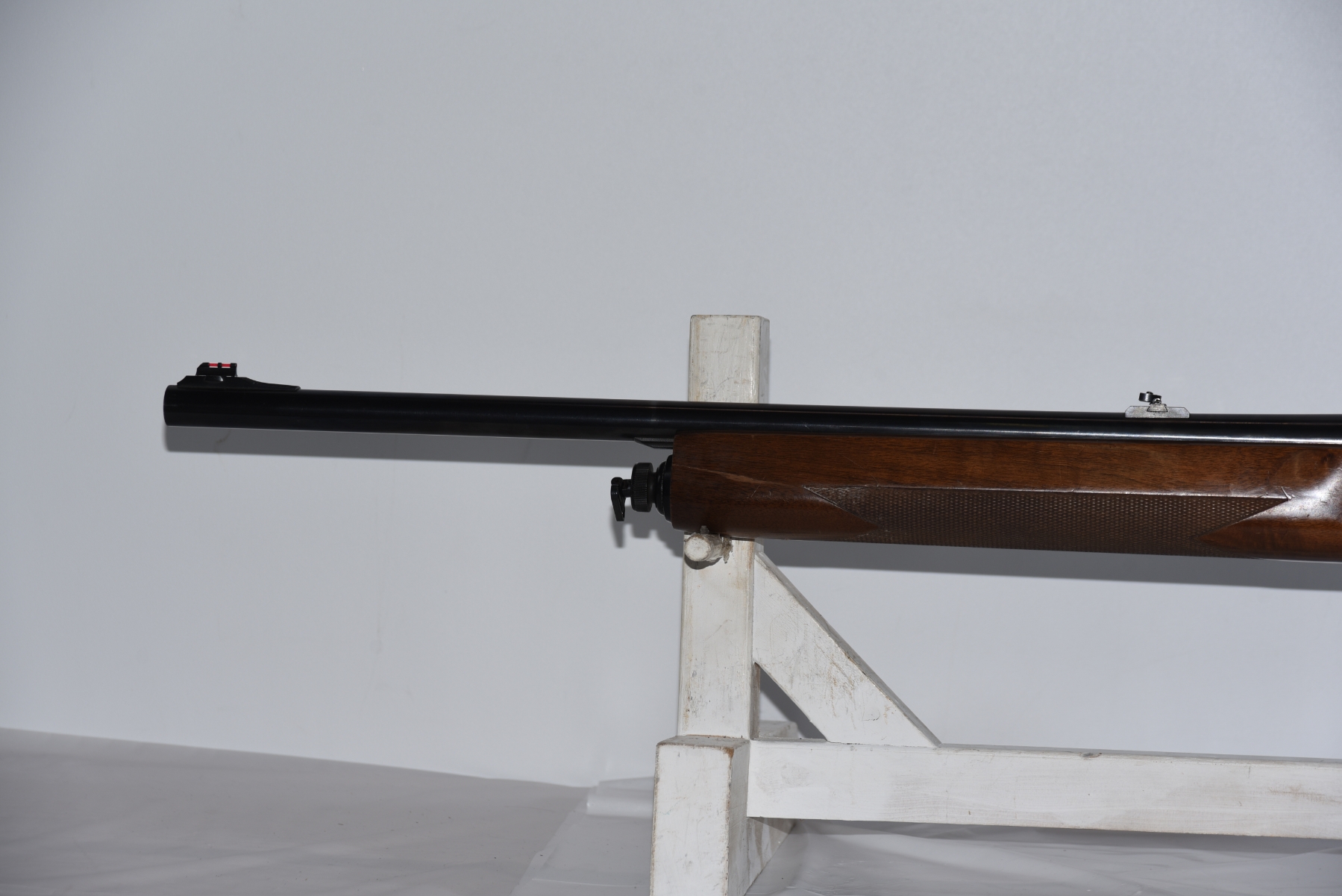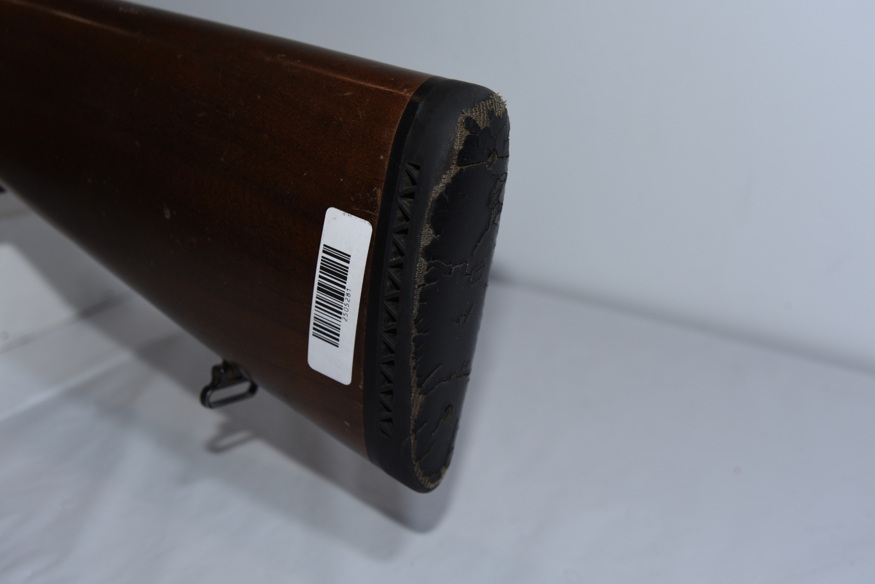 Wood stock shows scratches, scuffs, light dents, rubber butt pad is worn; condition is very good.