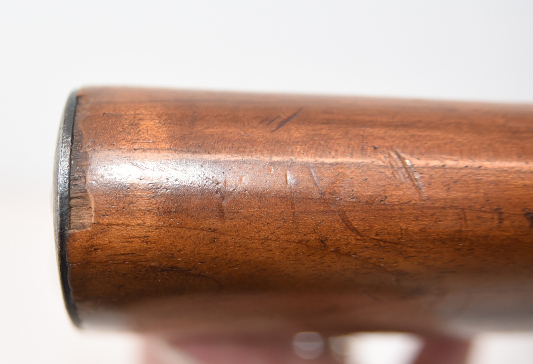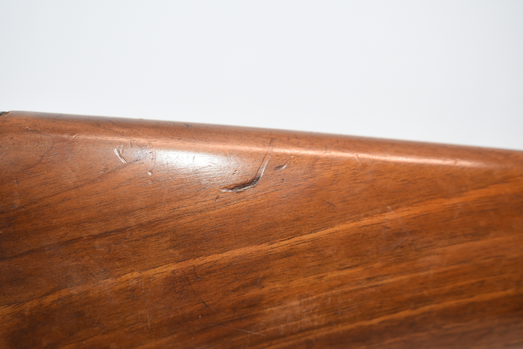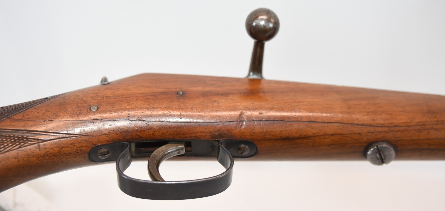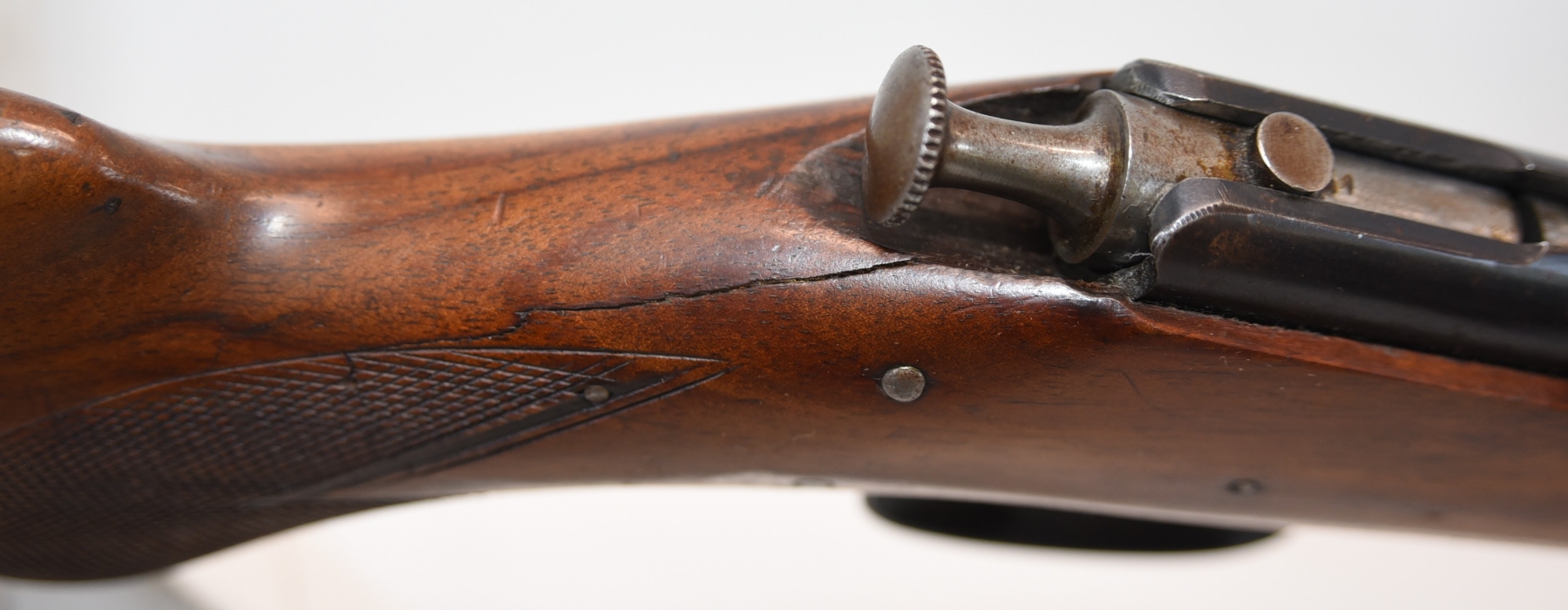 Wood stock shows repair at the grip area, there are scratches and scuffs, crack in the grip area; condition is fair.