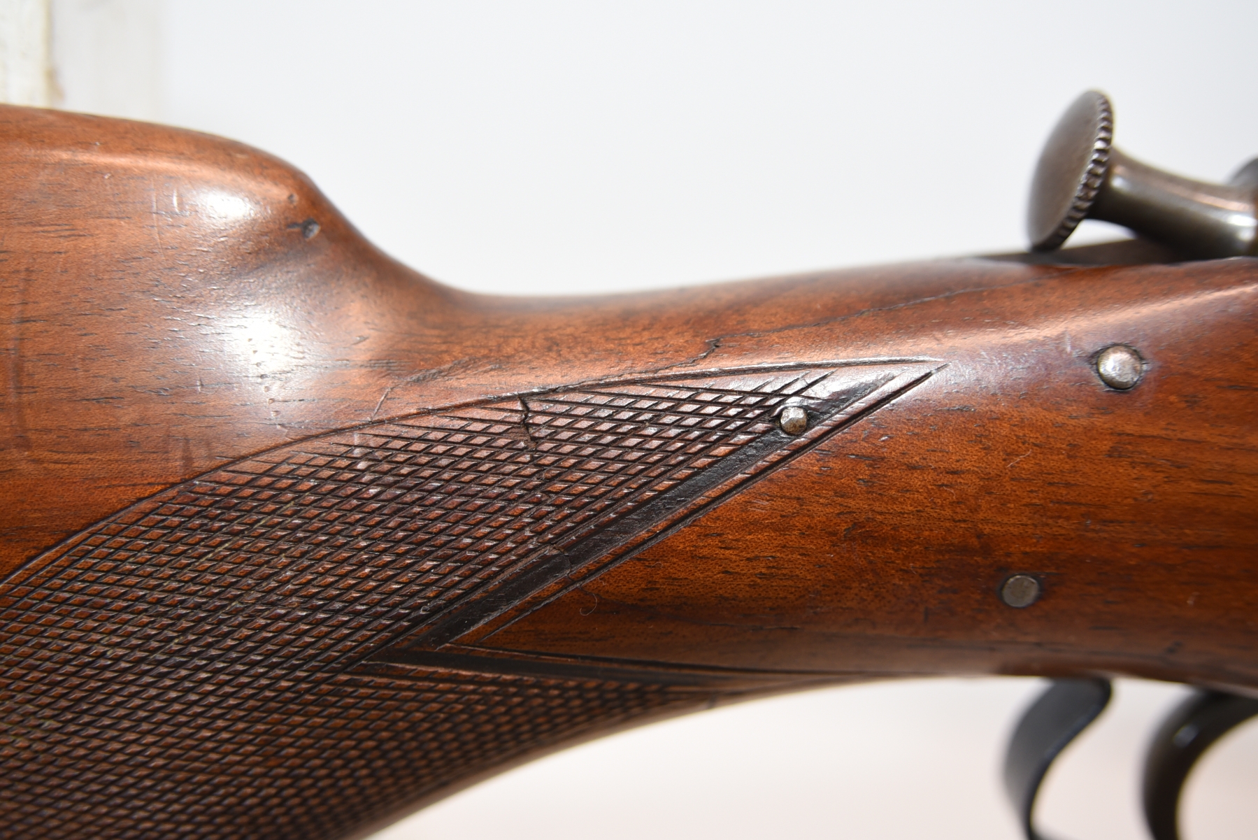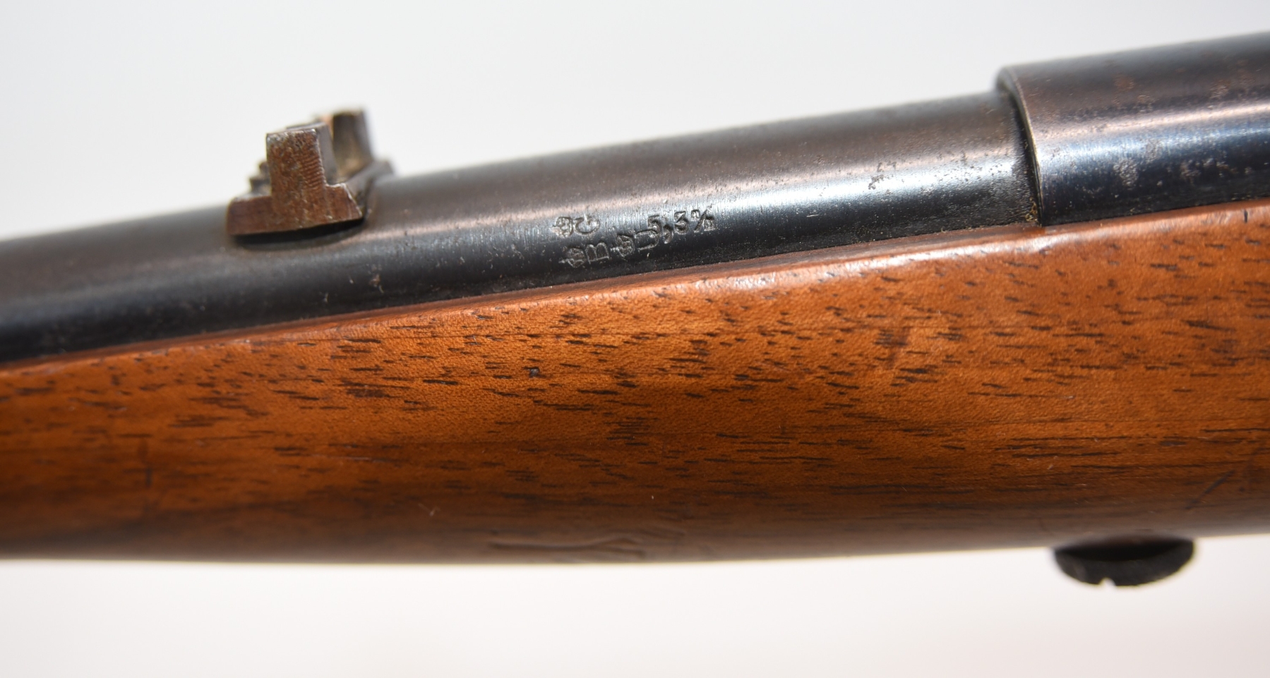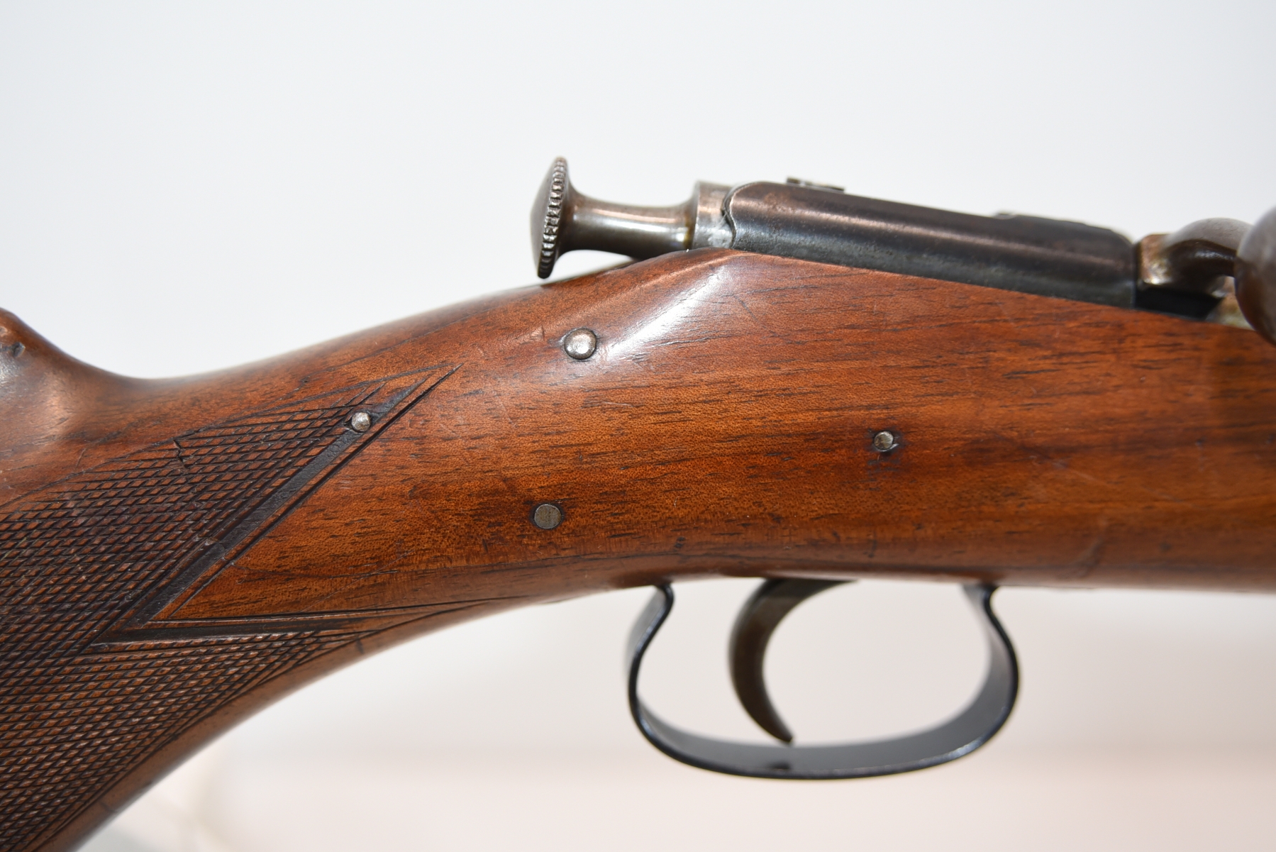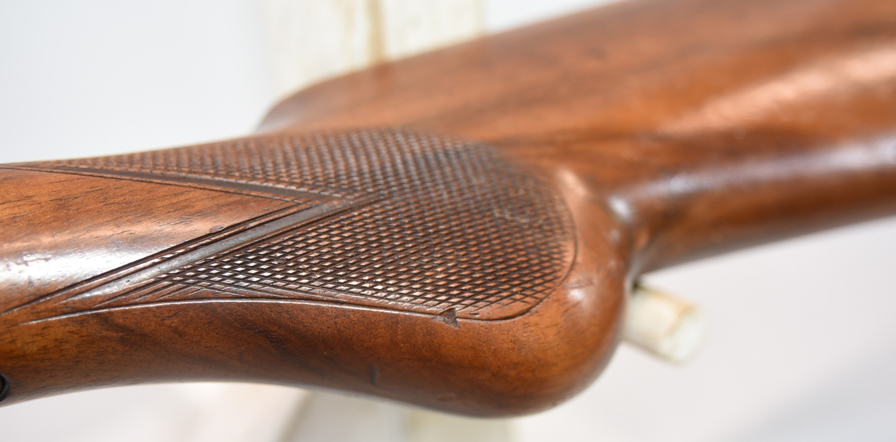 Wood stock shows repair at the grip area, there are scratches and scuffs, crack in the grip area; condition is fair.