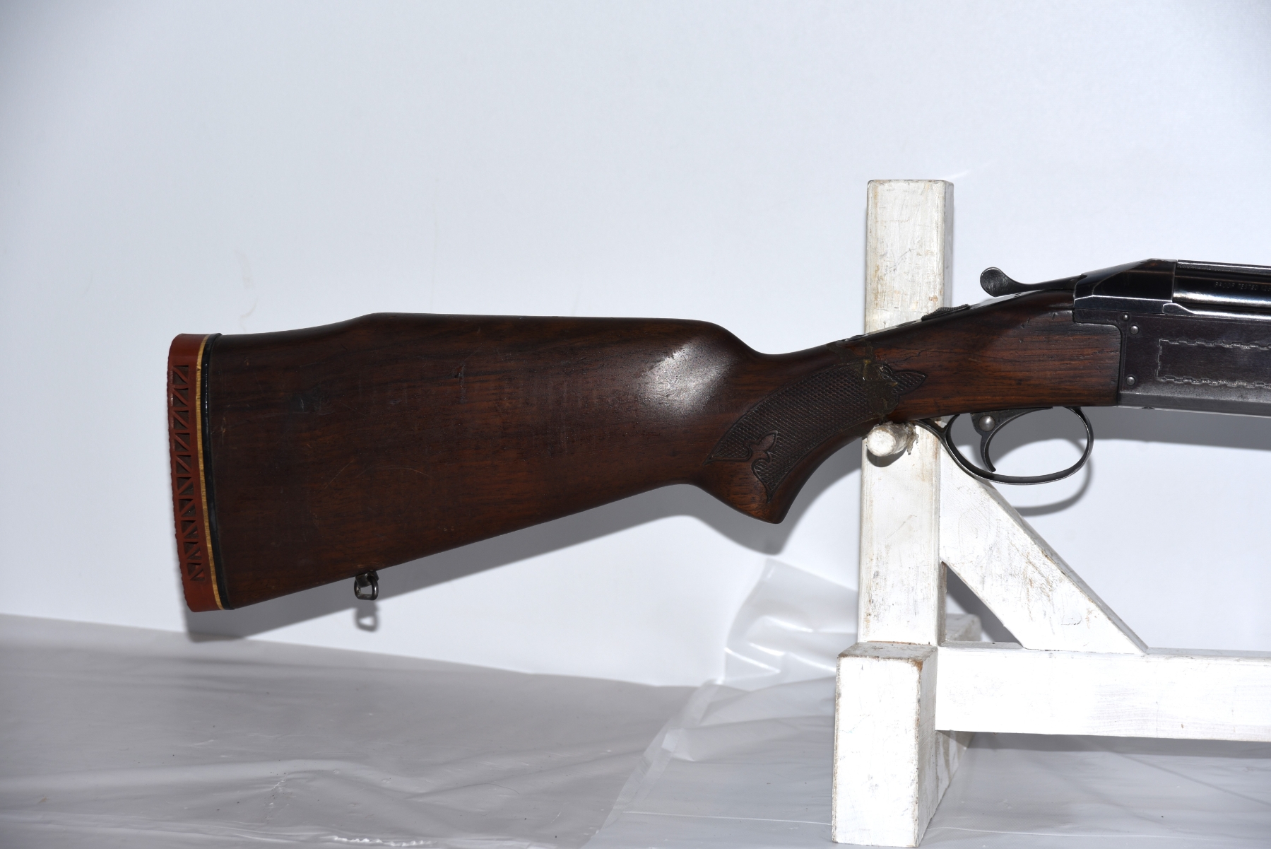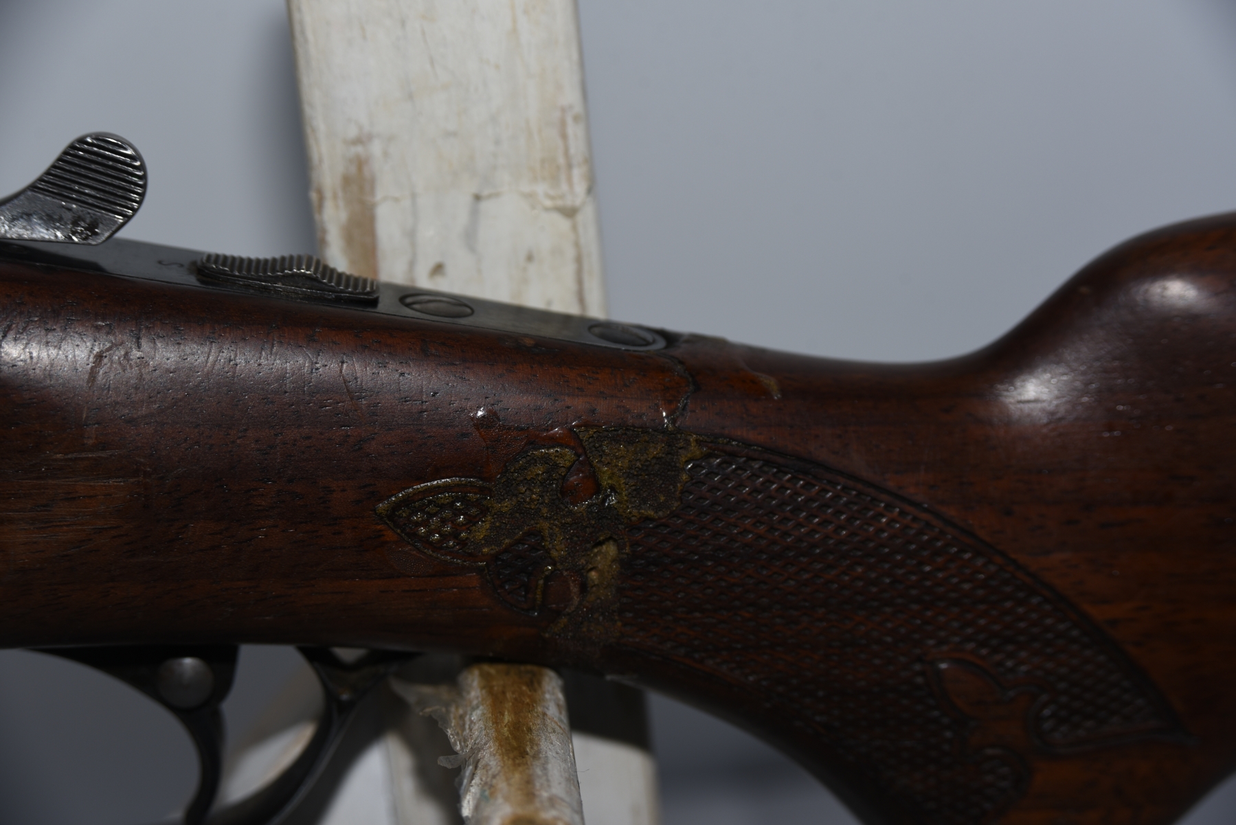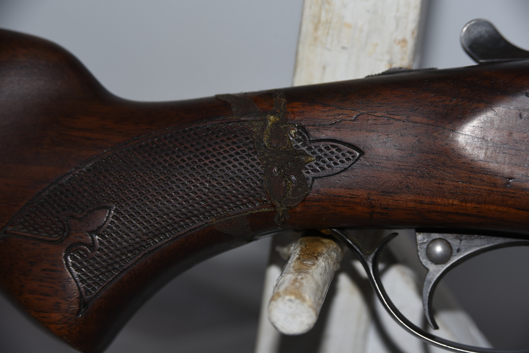 Wood stock shows a break/repair in the grip section, small cracks, scratches, scuffs, dents, finish wear; condition is poor.