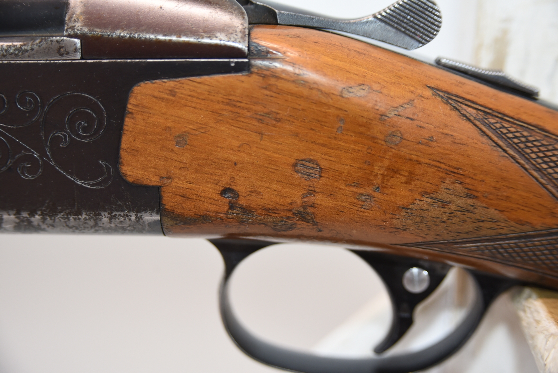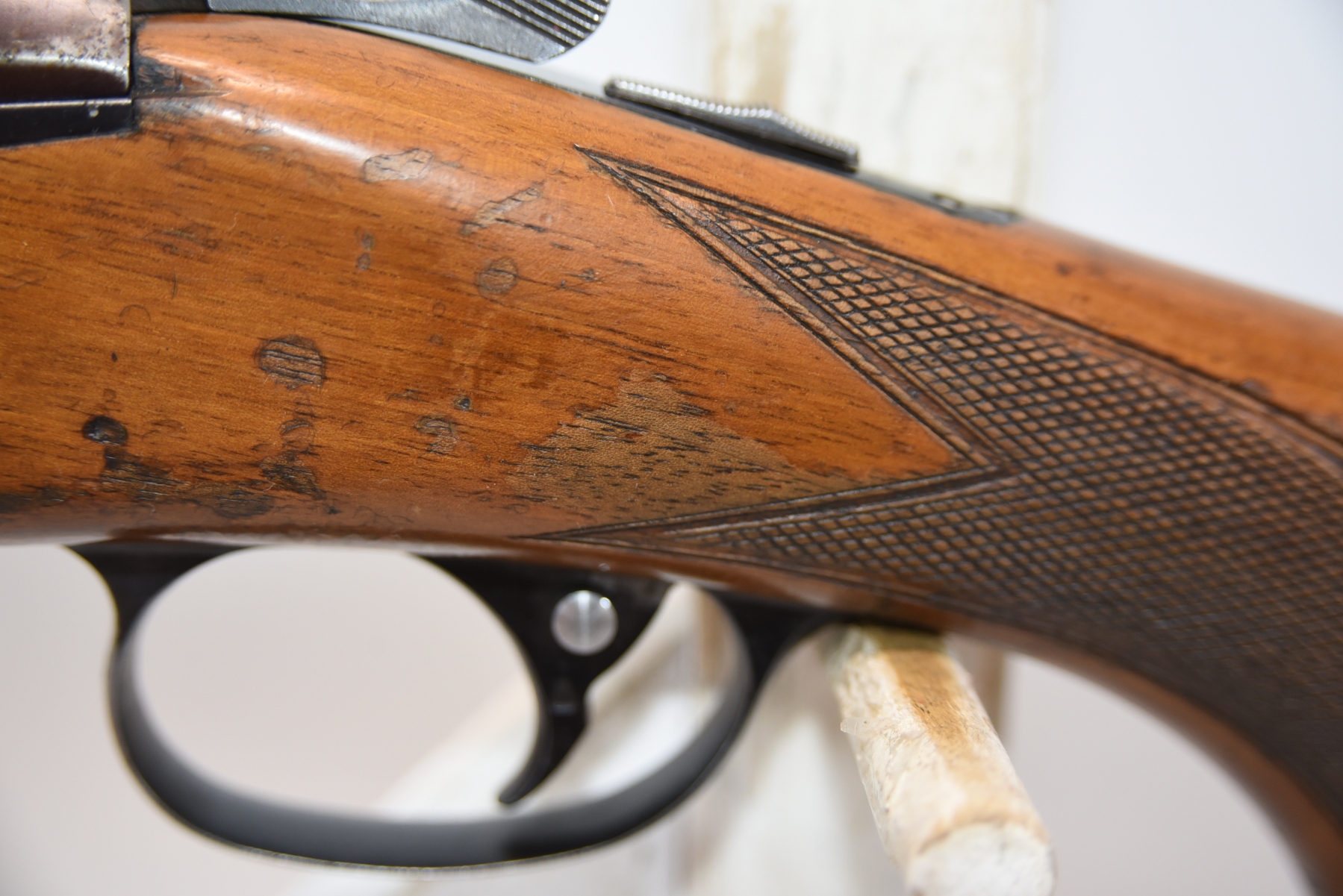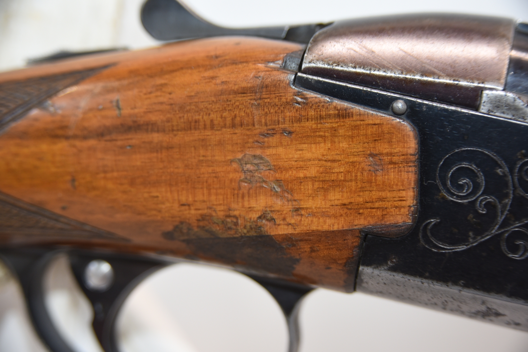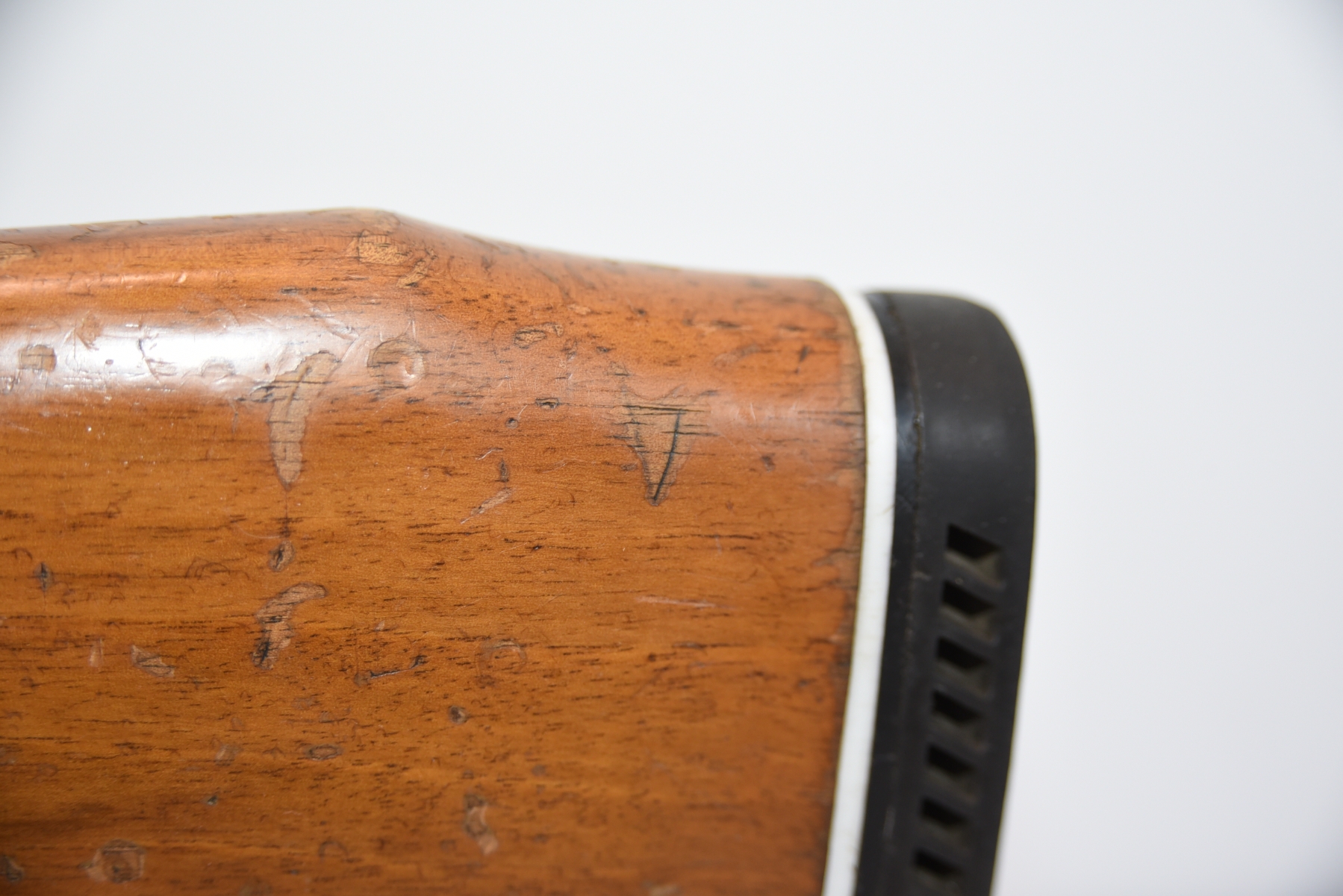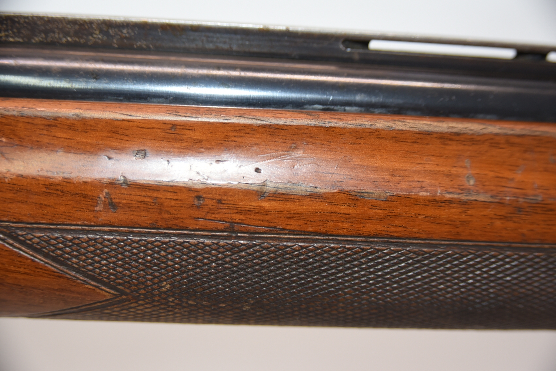 Wood stock shows cracks in the forearm, there are also cracks in the grip area and the upper right side. There is finish wear, scuffs, scratches, and dents. Condition is fair.