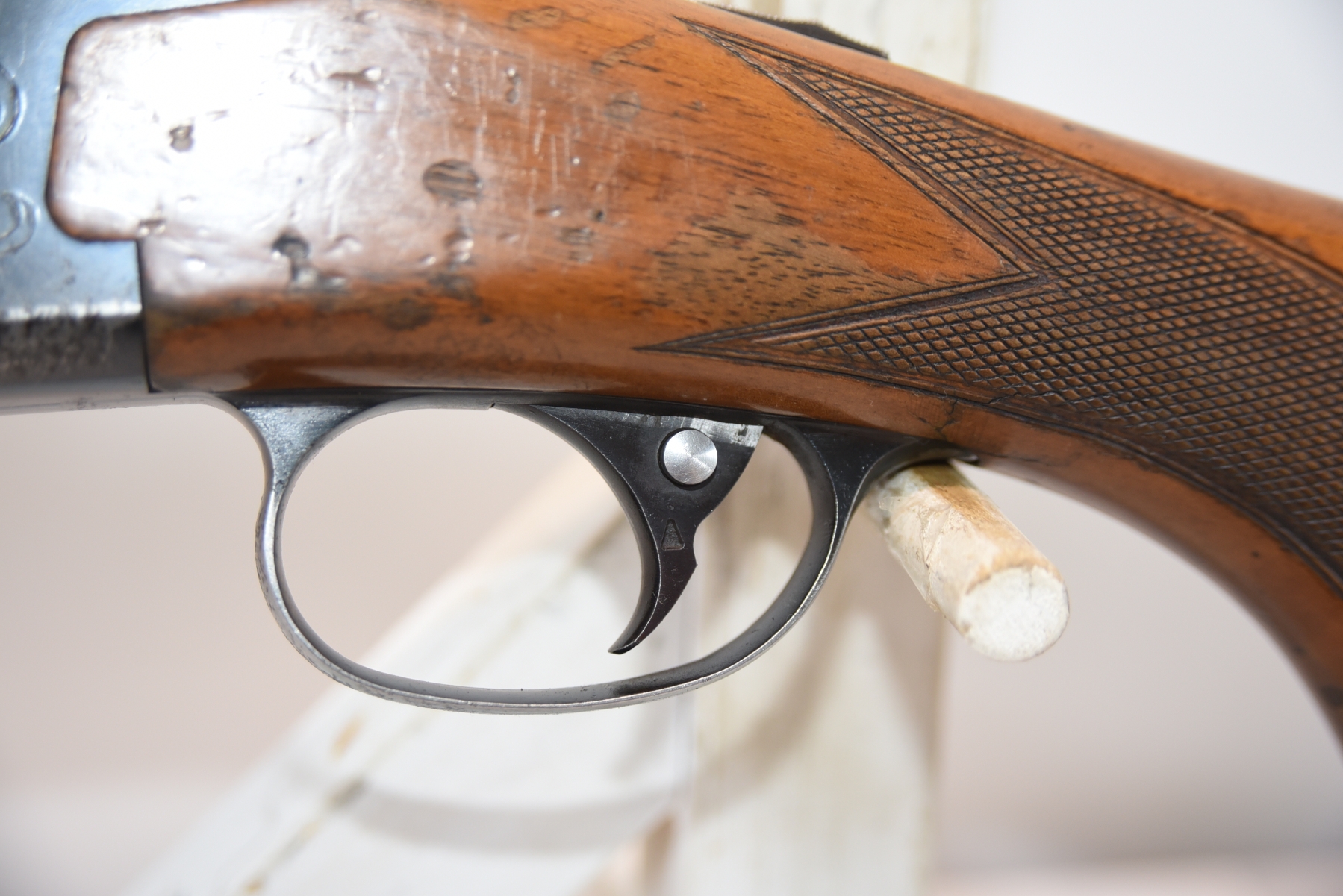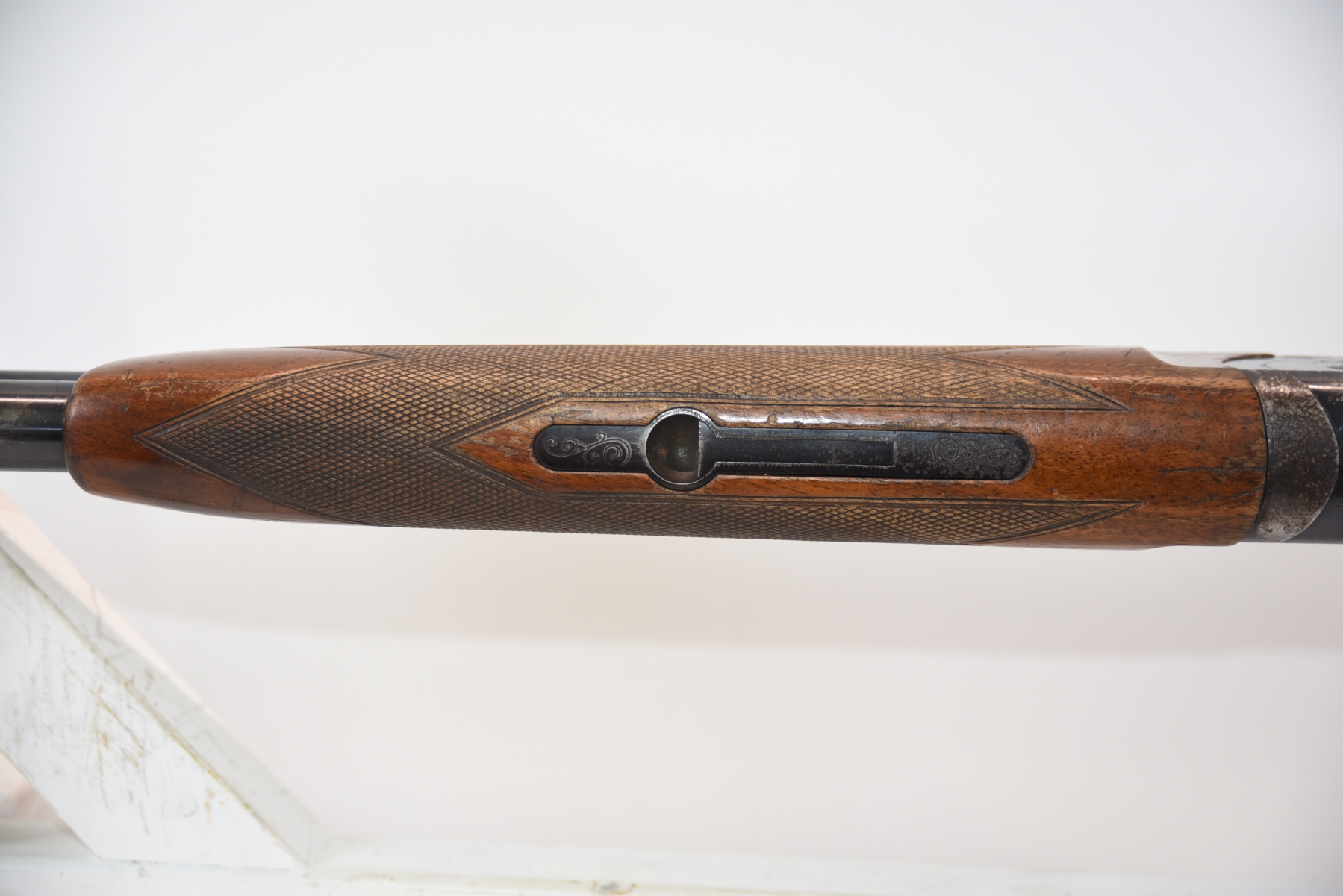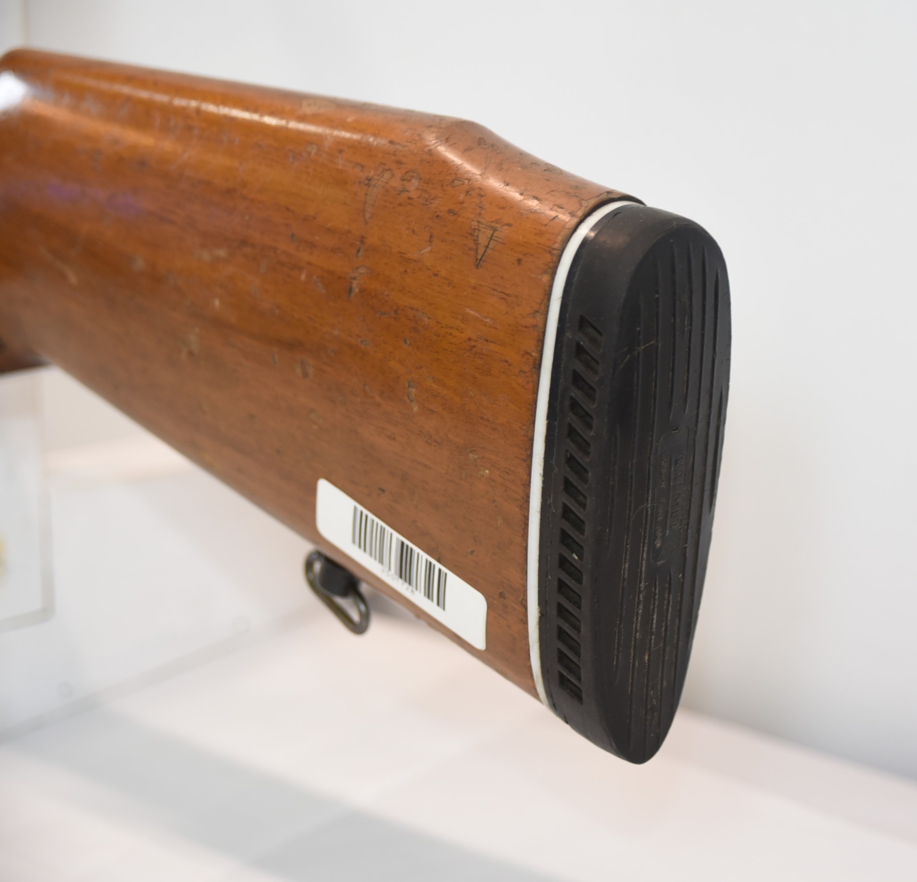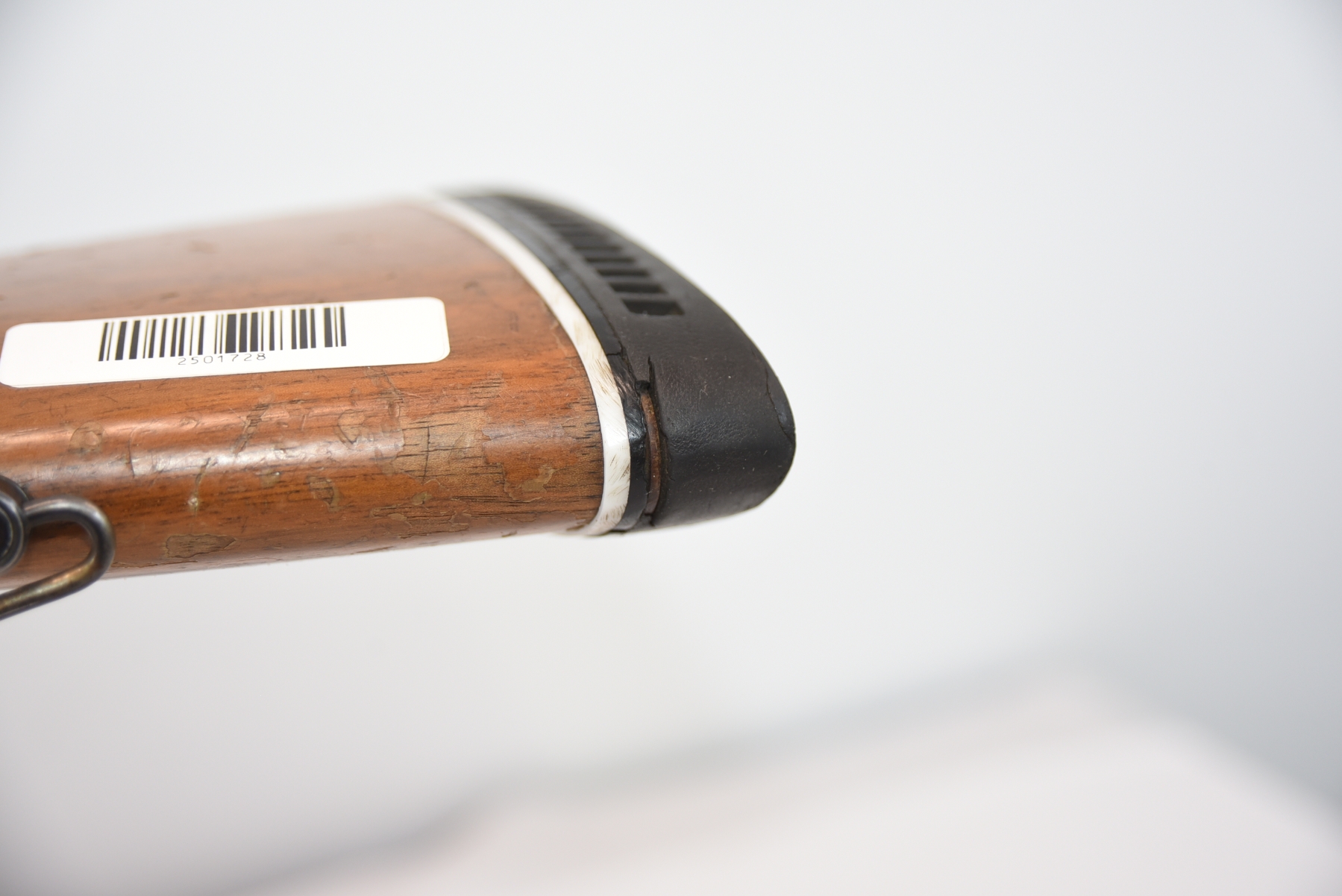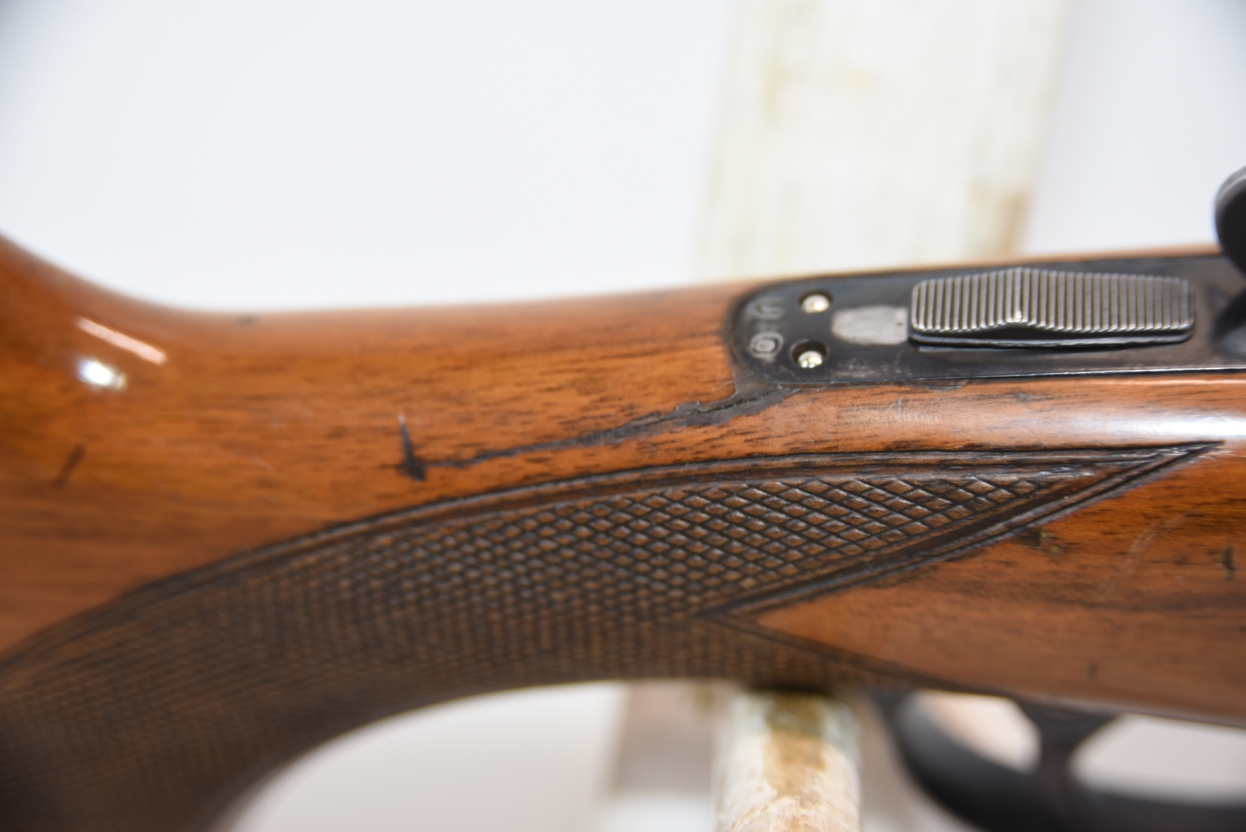 Wood stock shows cracks in the forearm, there are also cracks in the grip area and the upper right side. There is finish wear, scuffs, scratches, and dents. Condition is fair.