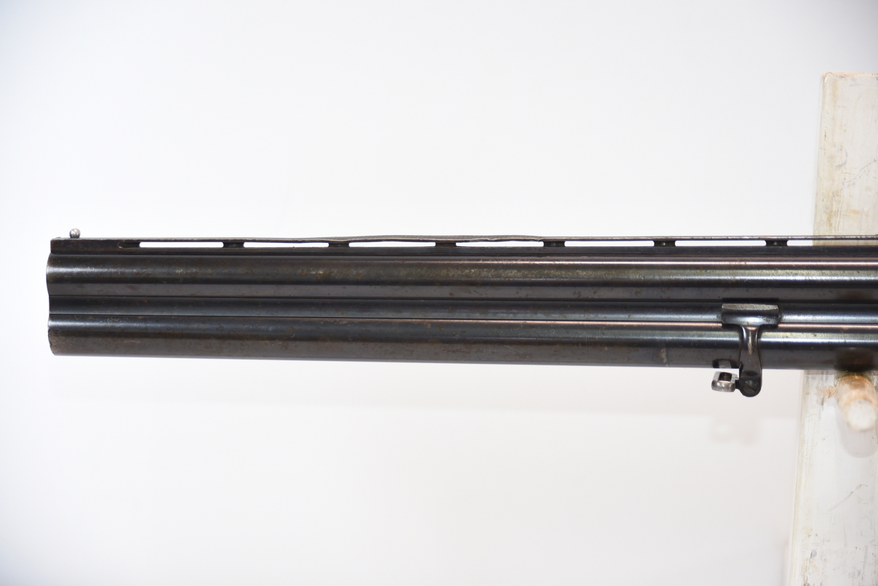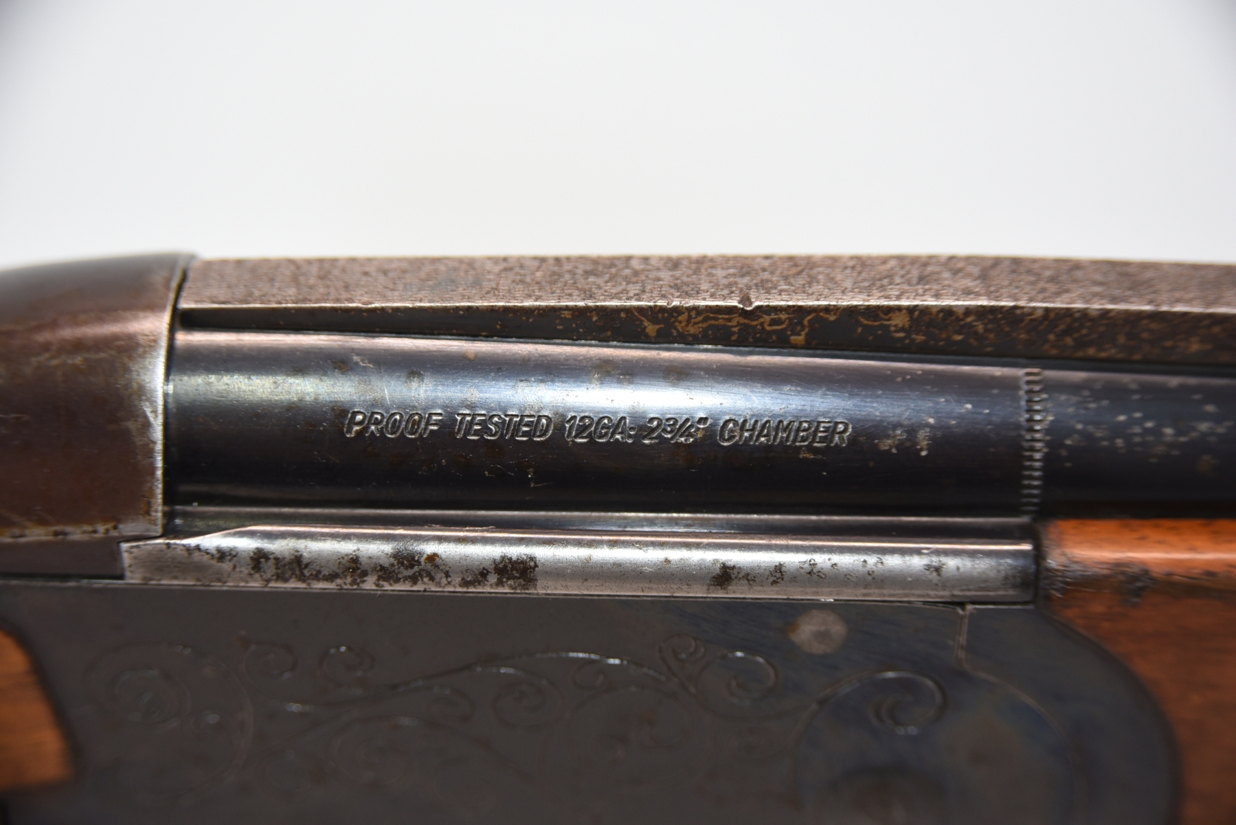 Metal finish shows tiny pitting on the receiver rib area, there are dents on the rib, there are rust spots in various areas along with finish wear; condition is less than fair.