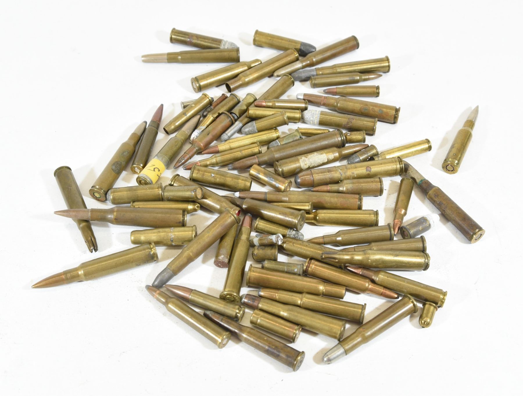 30 unknown rounds. 1 380 Kynoch blank. 5 pieces unknown blanks. 1 piece 223 Rem brass. 1 piece 30SPG brass. 1 unknown round bird shot. 2 rounds 38SPL bird shot. 1 round bird shot with headstamp "RAMSET 37". 1 round 38 WCF bird shot. 1 round 32 S&W bird shot. 1 round 44 WCF bird shot. 1 round 38 Long bird shot. 1 round 32 WCF bird shot.1 round 223 Rem. 1 round 22-250Rem. 1 round 303 Savage.