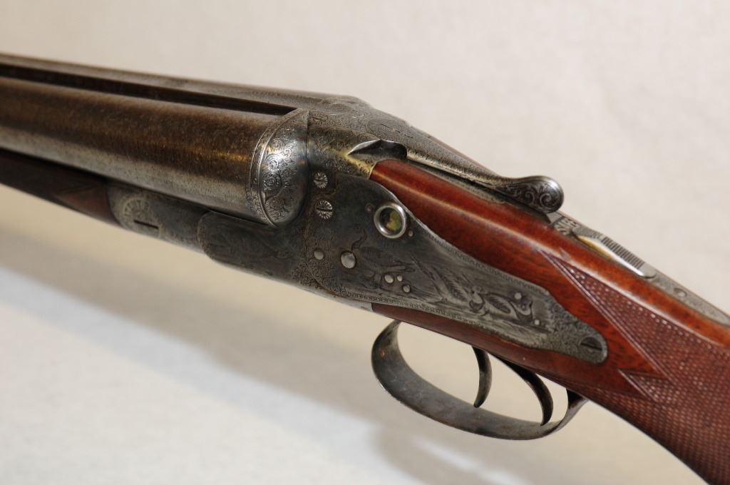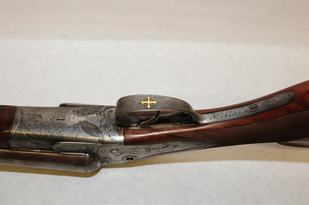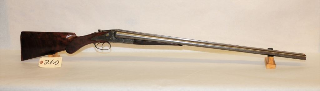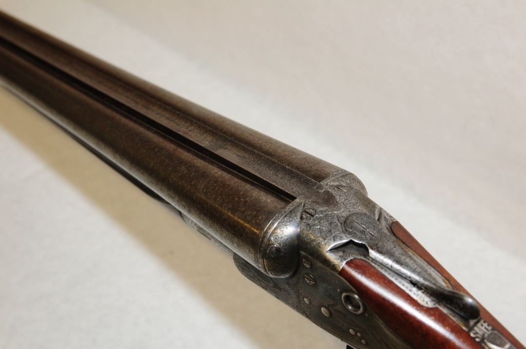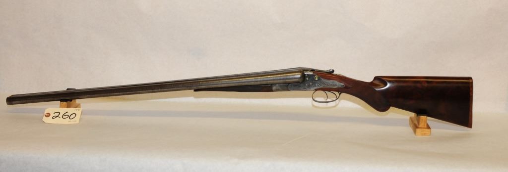 Non-Restricted, Multi Barrel, 10 GA, 30" damascus barrels with fixed full chokes, SN 34793. Wood excellent. bluing is gone and turning brown, bores excellent. Fine engraving, hammerless block safety, crystal cocking indicators, wooden butt plate, tight action.