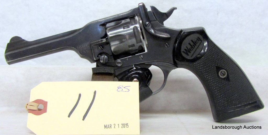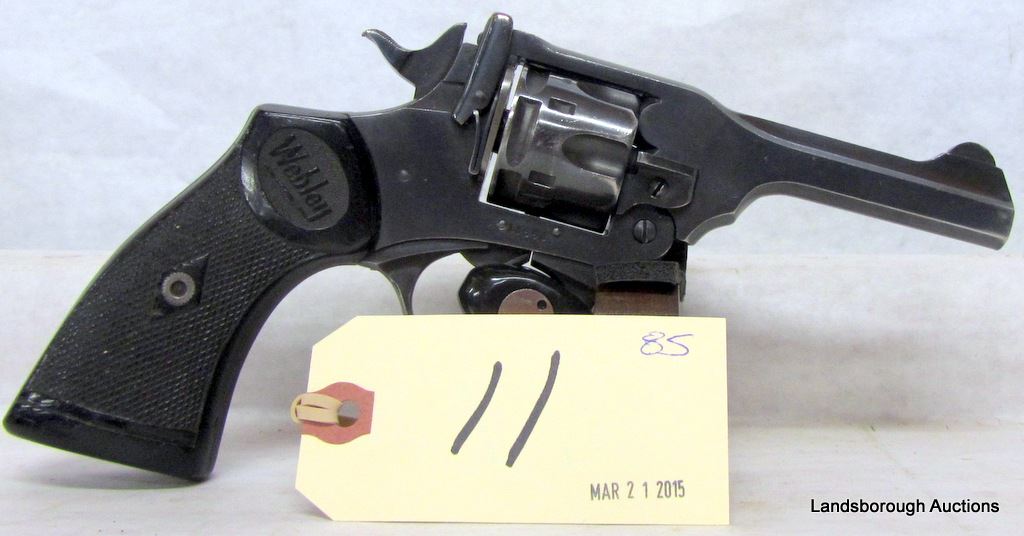 PROHIBITED, REVOLVER, 38 S&W, 102MM BARREL, SN A13658. GRIPS CHIPPED AND SCRATCHED, BLUING SCRATCHED AND WORN, BORE VERY GOOD. MAY NOT BE PERMISSABLE FOR INMPORTATION INTO USA.
