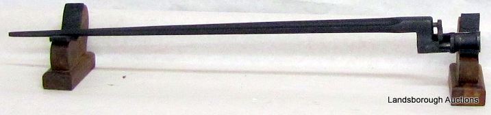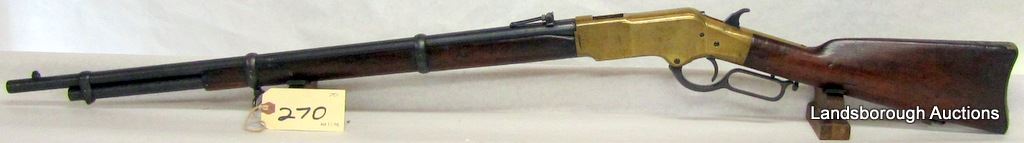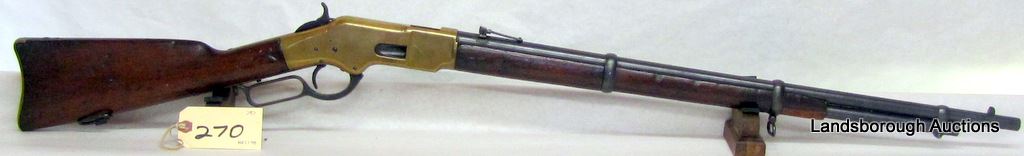 NON-RESTRICTED, LEVER ACTION, UNKNOWN 44 RF, 27" BARREL, SN 34393. WOOD HAS NUMEROUS DEEP DENTS, BARREL & MAG BADLY PITTED, BRASS RECEIVER HAS SOME SCRATCHES AND MARKS, BORE PITTED RIFLING EVIDENT. MFD 1879. COMES WITH MOSIN NAGANT BAYONET.
