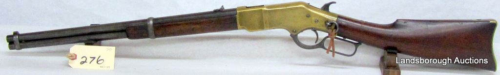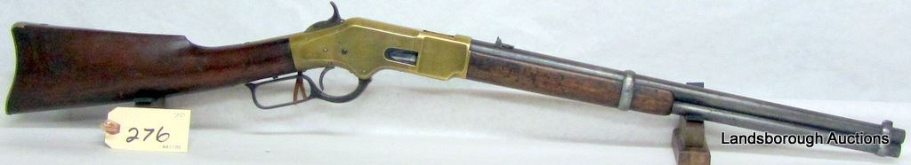 NON-RESTRICTED, LEVER ACTION, 44 RF, 20" BARREL, SN UNKNOWN. WOOD HAS FINE CRACK BEHIND RECEIVER, BLUING IS BROWN, BRASS RECEIVER HAS SCRATCHES AND DENTS, BORE FAIR.