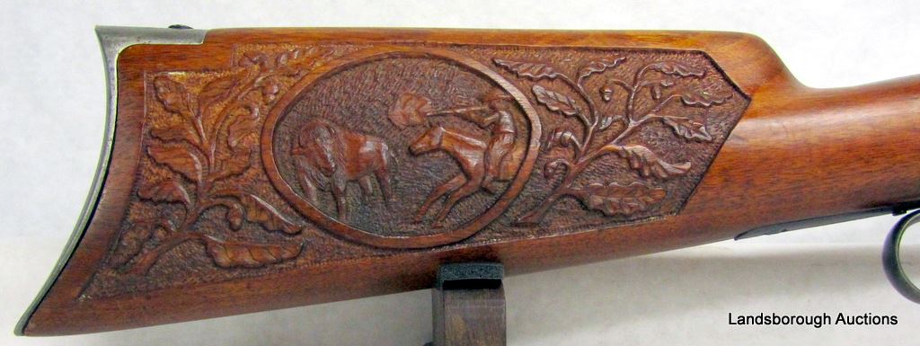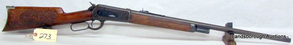 NON-RESTRICTED, LEVER ACTION, 45-70, 25 1/2" BARREL, SN 135035. WOOD HAS REPAIRED FOREARM AND ENGRAVED BUTT STOCK, BLUING BROWN, BORE PITTED. MFD 1903. BUTTON MAG.