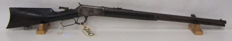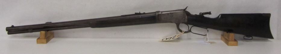 NON-RESTRICTED, 25-20WCF, 23.5" BARREL, S/N 871462, WOOD HAS TYPICAL AGE MARKS WITH ONE CRACK NEAR LEVER AND ONE CRACK ON FOREGRIP, BLUEING AQUIRED PATINA AND SMALL DINGS AND SCRATCHES CONSISTENT WITH AGE, BORE IN GOOD