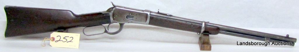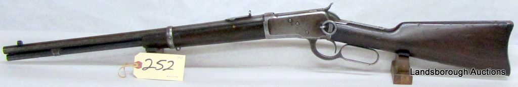 NON-RESTRICTED, LEVER ACTION, 32 WCF, 20" BARREL, SN 547800. WOOD HAS GOUGES, SCRATCHES AND DENTS, BLUING GREY AND BROWN, BORE HAS PITTING. MFD 1910. SLING SWIVEL MISSING ON BUTT STOCK.