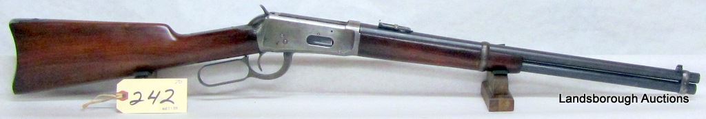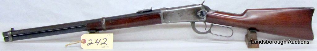 NON-RESTRICTED, LEVER ACTION, 38-55 WIN, 20" BARREL, SN 462236. WOOD REFINISHED, BLUING BARE OR GREY, BORE PITTED. MFD 1908.