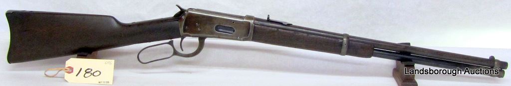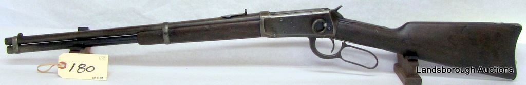 NON-RESTRICTED, LEVER ACTION, 38-55, 20" BARREL, SN 197092. WOOD BUTT STOCK SANDED, FOREARM HAS NUMEROUS DENTS, BLUING IS BROWN, BORE HAS SOME LARGE PIT MARKS, WORN RIFLING. MFD 1900. SADDLE RING.