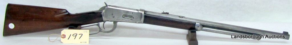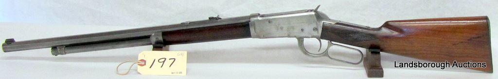 NON-RESTRICTED, LEVER ACTION, 30 WCF, 20" OCTAGONAL BARREL, SN 288741. WOOD HAS SMALL DENTS AND SCRATCHES, CHECKERING ADDED, BLUING IS GONE, BORE STAINED WITH LIGHT PITTING. MFD 1903.
