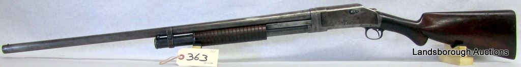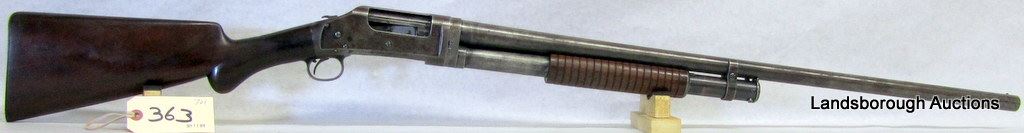 NON-RESTRICTED, PUMP ACTION, 12GA X 2 3/4", 30" BARREL WITH FIXED FULL CHOKE, SN D255789. WOOD HAS NUMEROUS MARKS AND SCRATCHES, BLUING IS BROWN OR MISSING, BORE PITTED.