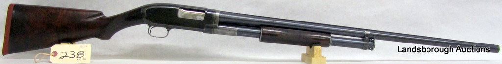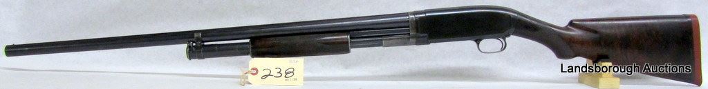 NON-RESTRICTED, PUMP ACTION, 12GA X 2 3/4", 30" BARREL WITH FIXED FULL CHOKE, SN 157184. WOOD HAS SMALL CRACK BEHIND RECEIVER, INLAID EBONY DIAMOND, BLUING IS GREY AND WORN, BORE EXCELLENT. MFD 1917.