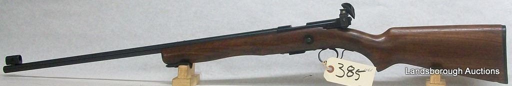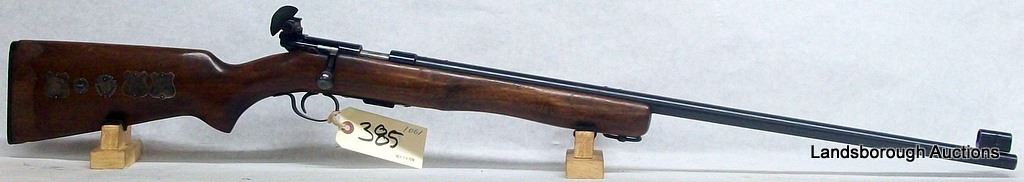 NON RESTRICTED BOLT ACTION 22 S,L,LR, 640MM BARREL. WOOD HAS SOME SCRATCHING AND EMBLEMS NAILED IN TO IT, BLUING IS VERY GOOD, BORE IS EXCELLENT.